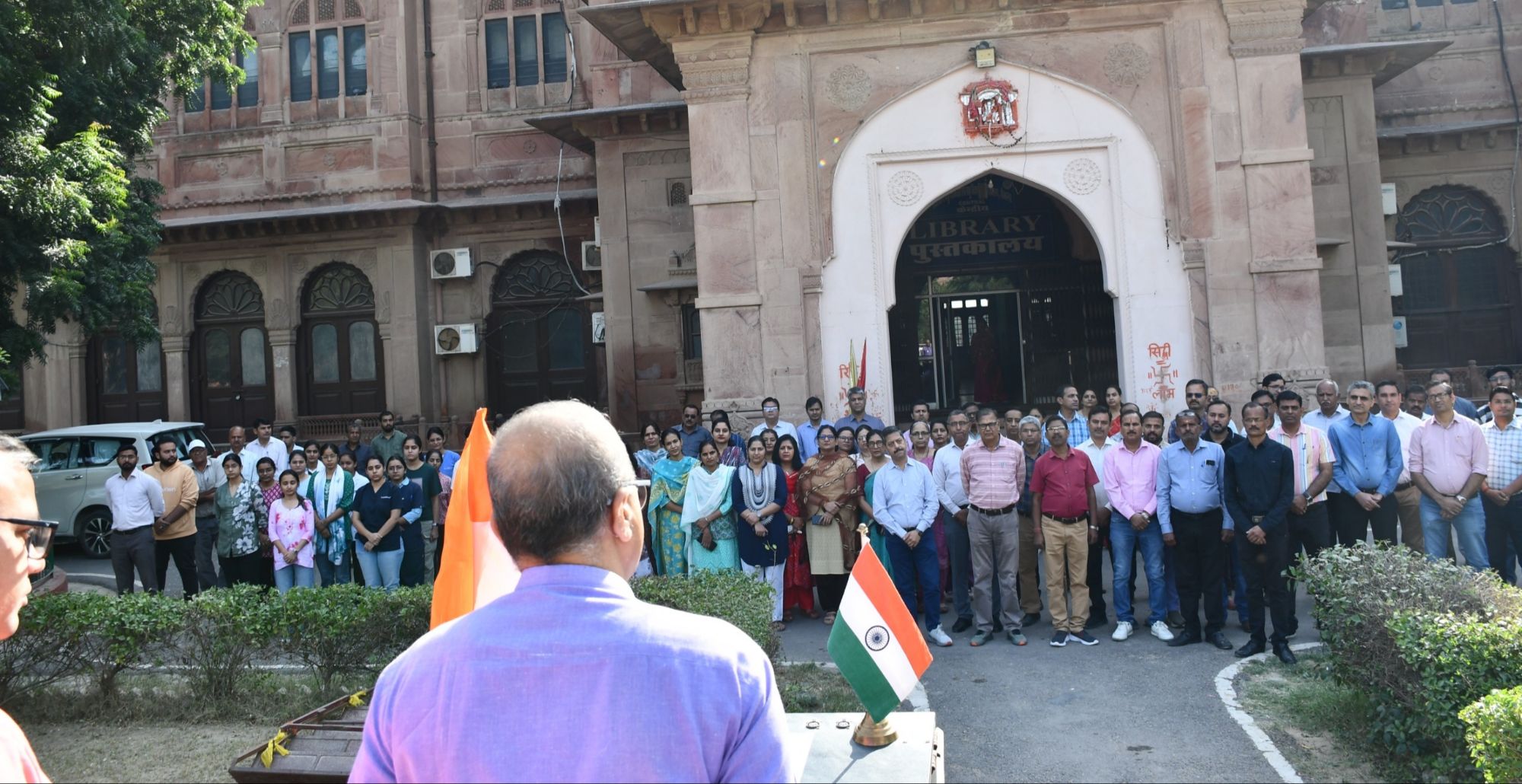 बीकानेर 07 नवंबर। राष्ट्रगीत वंदे मातरम् के 150 वर्ष पूर्ण होने के उपलक्ष मे राजस्थान पशुचिकित्सा और पशु विज्ञान विश्वविद्यालय के प्रांगण में कुलगुरु डॉ. सुमंत व्यास के सानिध्य में शुक्रवार को राष्ट्रगीत वंदे मातरम् का सामूहिक गायन किया गया। कुलगुरु डॉ. सुमंत व्यास ने वंदे मातरम को एक प्रेरणा स्त्रोत बताया जिसने पूरे देश में देशभक्ति की एक स्थायी भावना को प्रज्वलित किया है एवं नागरिकों में देश प्रेम की भावना से सरोबार किया है। कार्यक्रम के दौरान अधिष्ठाता वेटरनरी महाविद्यालय, बीकानेर एवं संकायाध्यक्ष प्रो. हेमंत दाधीच ने सभी का स्वागत किया एवं सहायक अधिष्ठाता छात्र कल्याण डॉ. अशोक डांगी ने मंच संचालन किया। कार्यक्रम के दौरान विश्वविद्यालय के डीन-डायरेक्टर, शिक्षक, कर्मचारी एवं विद्यार्थी उपस्थित रहे।