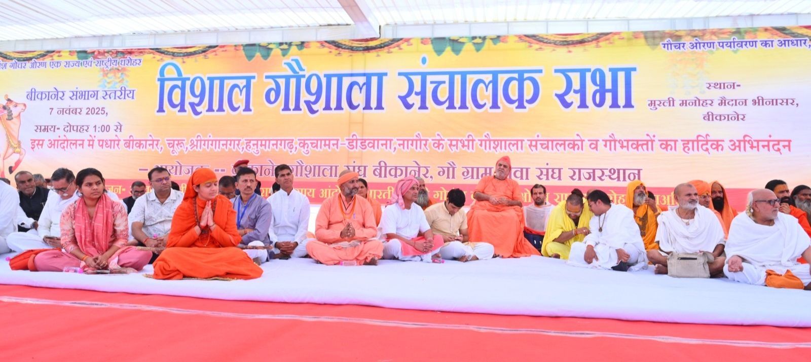 विशाल सभा का आयोजन पूज्य संतों के पावन सानिध्य में किया गया इस सभा में पूज्य संत क्षमाराम जी महाराज बीकानेर, महामंडलेश्वर ज्ञान स्वरूपानंद जी महाराज जोधपुर, महामंडलेश्वर सरजू दास जी महाराज बीकानेर, महंत परशुराम दास जी महाराज जयपुर ,संत चंद्रमा दास जी महाराज सीकर, कथा वाचक शंकर जी महाराज सरदारशहर, कथा वाचक सुखदेव जी महाराज गडियाला, महंत भगवान दास जी जांबा फलोदी, संत आकाशवाणी जी महाराज श्रीगंगानगर, संत अमरानंद जी महाराज, संत शंभू गिरी जी महाराज, संत रामप्रकाश जी महाराज महंत श्याम गिरी जी महाराज रातडिया धाम, संत चंद्रशेखर जी महाराज भैलु, गौ कथा वाचक श्रद्धा गोपाल दीदी चूरू, किशन गिरी जी महाराज तारानगर चूरू, सुनील जी महाराज व सुनीता दीदी झुंझुनू