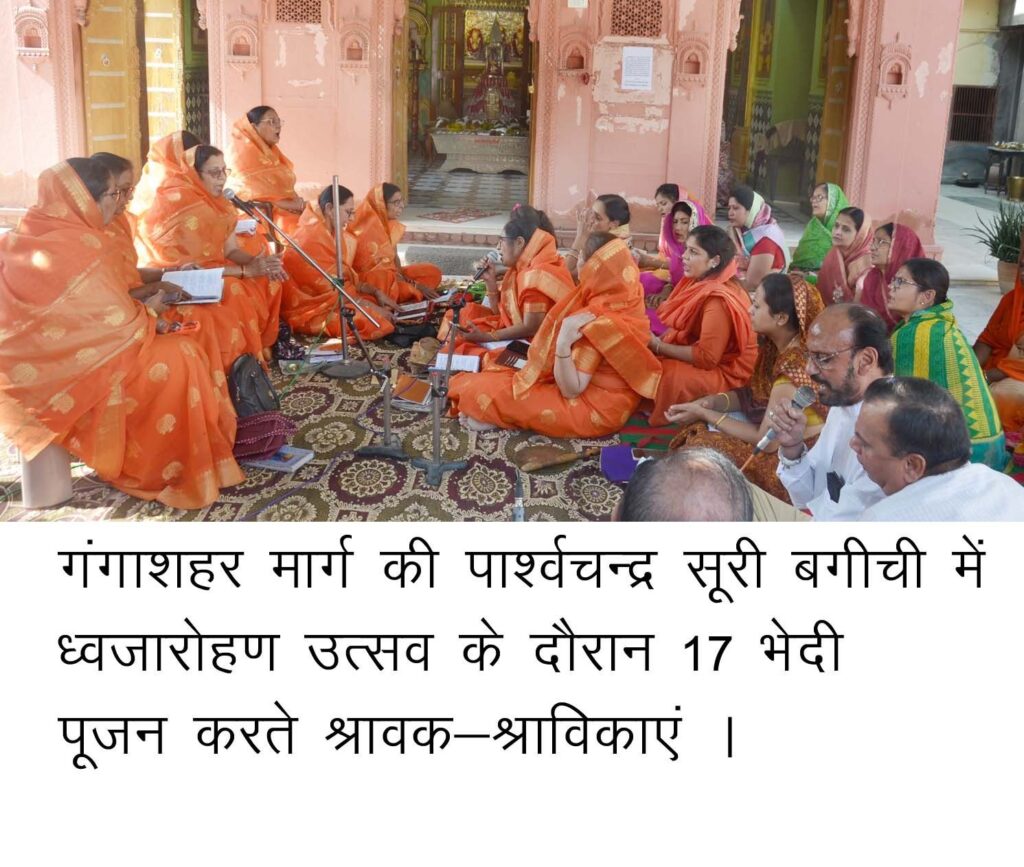जैन श्वेताम्बर पार्श्वचन्द्र गच्छ संघ के अध्यक्ष रविन्द्र रामपुरिया ने बताया कि सतरह भेदी पूजा में पार्श्वचन्द्र महिला मंडल के साथ पप्पूजी बांठिया, संघ के सचिव प्रताप रामपुरिया ने न्वाहण पूजा, विलेपन, वस्त्र,गंध, पुष्पारोहण, माल पूजा, अंगीरचना, चूर्ण पूजा, ध्वज पूजा ’’ (पंच वरण ध्वज शोभती, घूघरीनों घमकार, हेम दंड मन मोहिनी, लघु पताका सार।। )’’ , आभरण पूजा, वाजित्र पूजा पुष्प गृह पूजा, पुष्प वर्षण पूजा अष्ट मंगल पूजा धूप पूजा, गीत पूजा, नृत्य नाटक पूजा विभिन्न राग व तर्जों पर गाए गए गीतों के साथ की गई।