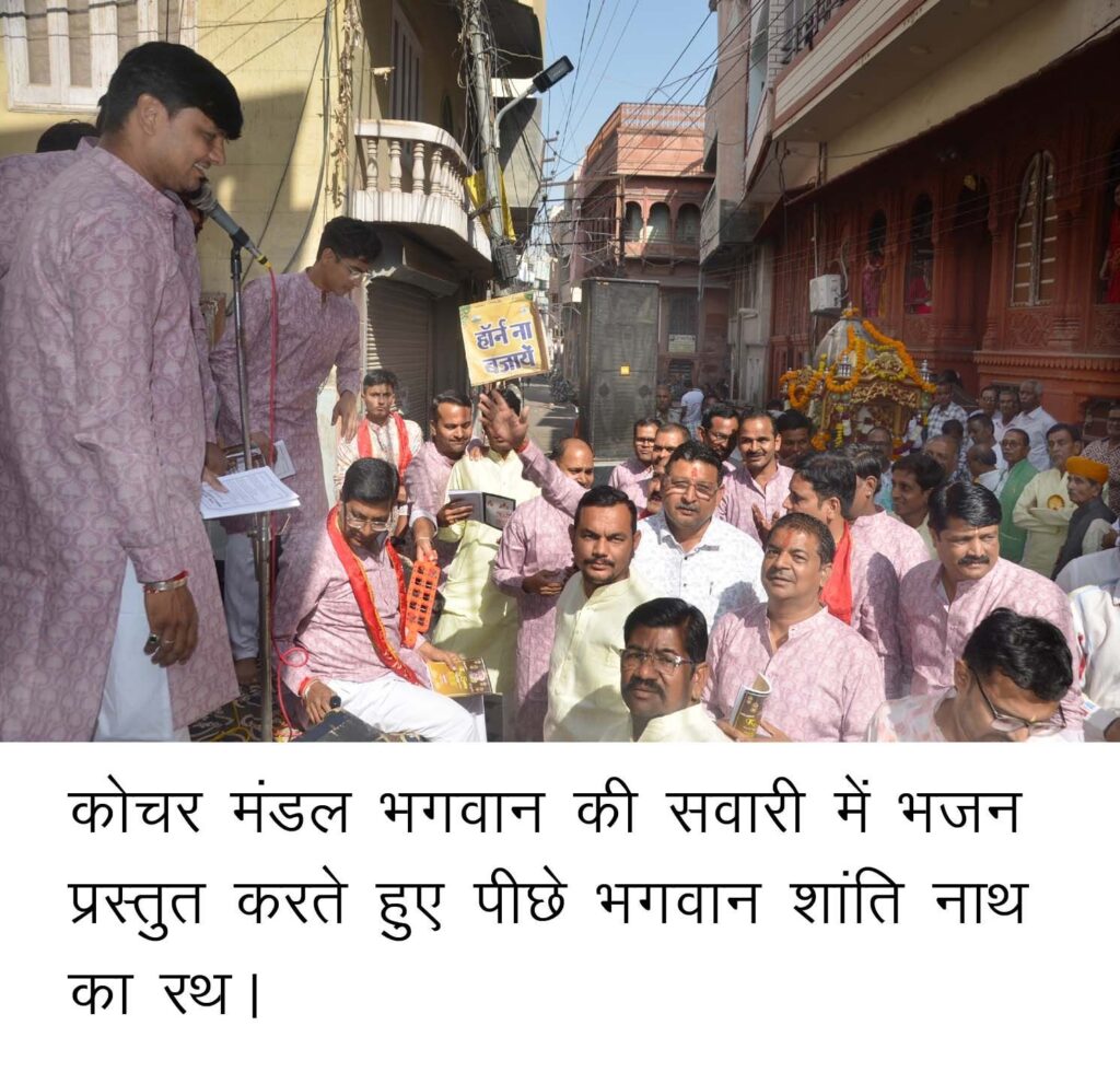 भगवान शांति नाथजी की सवारी में पंचरंगी जैन ध्वज, भगवान महावीर के आदर्शों से संबंधित 9 तेल चित्र, चांदी का सिंहासन, कल्पवृक्ष, वीर मंडल महावीर मंडल, श्री जैन मंडल, जैन गौतम मंडल व आदिश्वर मंडल के सजे संवरे ऊंट गाड़ों पर बच्चे बैठे हुए जयकारा लगा रहे थे। वहीं श्रावक ’’ चंदन की दो चौकियां, पुष्पन के दो हार, केसर भरियों बाटको, पूजा नैन कुमार’’ के साथ देव गुरु व धर्म के नारे लगा रहे थे।