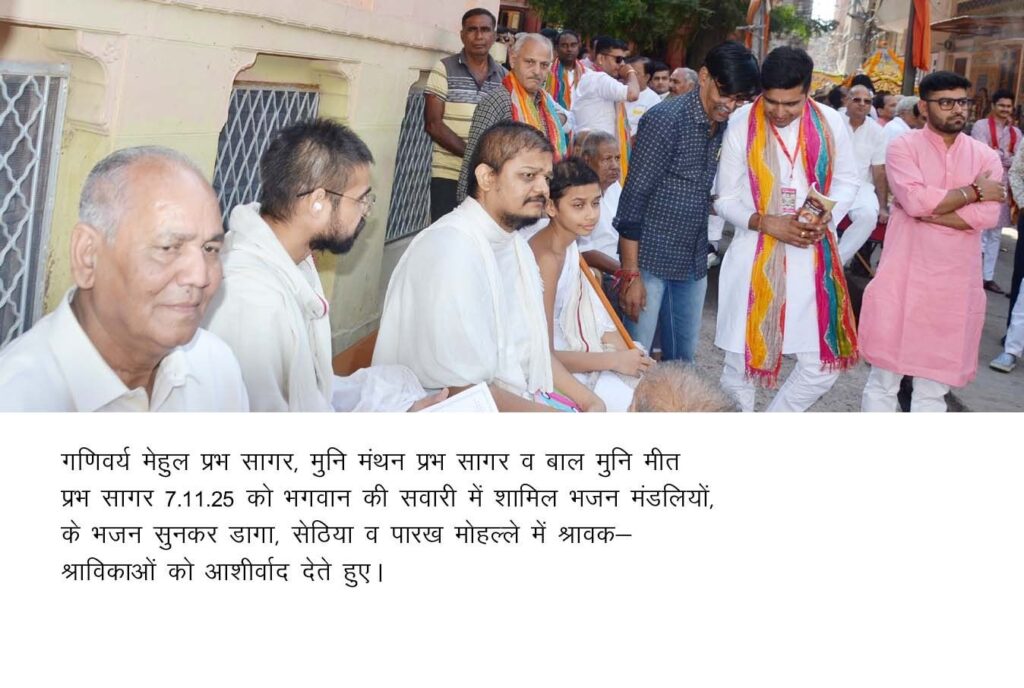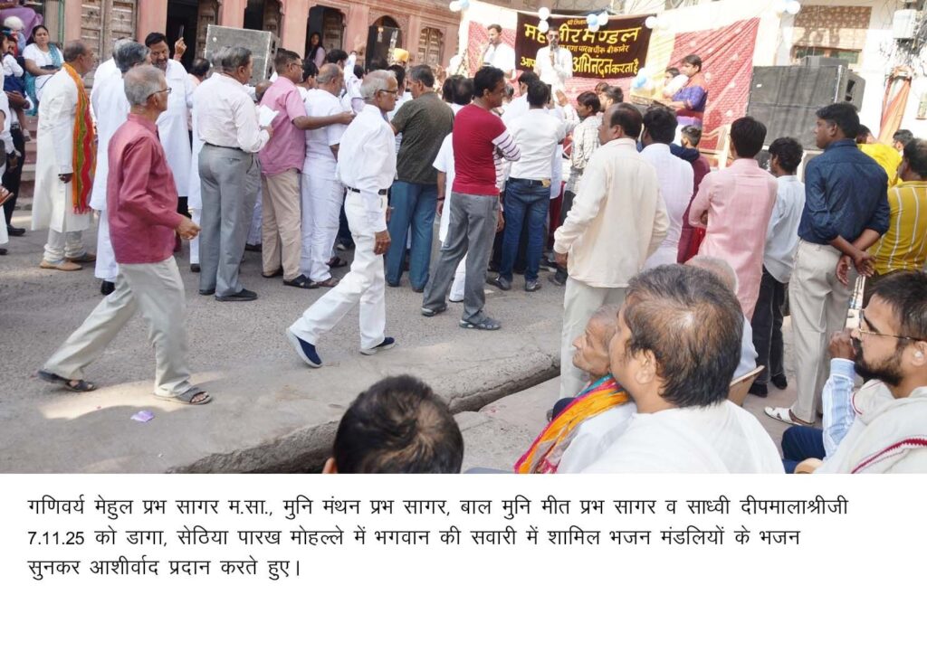 गणिवर्य मेहुल प्रभ सागर म.सा. व साध्वीदीप शिखा श्रीजी म.सा. आदिठाणा ने मुकीम बोथरा तथा डागा, सेठिया व पारख मोहल्ले में छह भजन मंडलियों के भजनों को सुना तथा भजन मंडलियों के कलाकारों को आशीर्वाद दिया। होलेण्ड की पर्यटक मरियम भी भगवान की सवारी में शामिल हुई तथा मुनि व साध्वीवृंद से आशीर्वाद लिया। उन्होंने जैन धर्मावलम्बियों की भगवान की सवारी को ’’वंडरफुल कल्चरल इवेंट ऑफ जैन समाज’’ बताया। श्री चिंतामणि जैन मंदिर प्रन्यास के अध्यक्ष हरीश नाहटा, कोषाध्यक्ष फतेहचंद खजांची, ट्रस्टियों व पूर्व अध्यक्ष निर्मल धारीवाल ने सवारी में शामिल सकलश्री संघ के श्रावक-श्राविकाओं, भजन मंडलियों के कलाकारों तथा पुलिस प्रशासन का आभार व्यक्त किया।