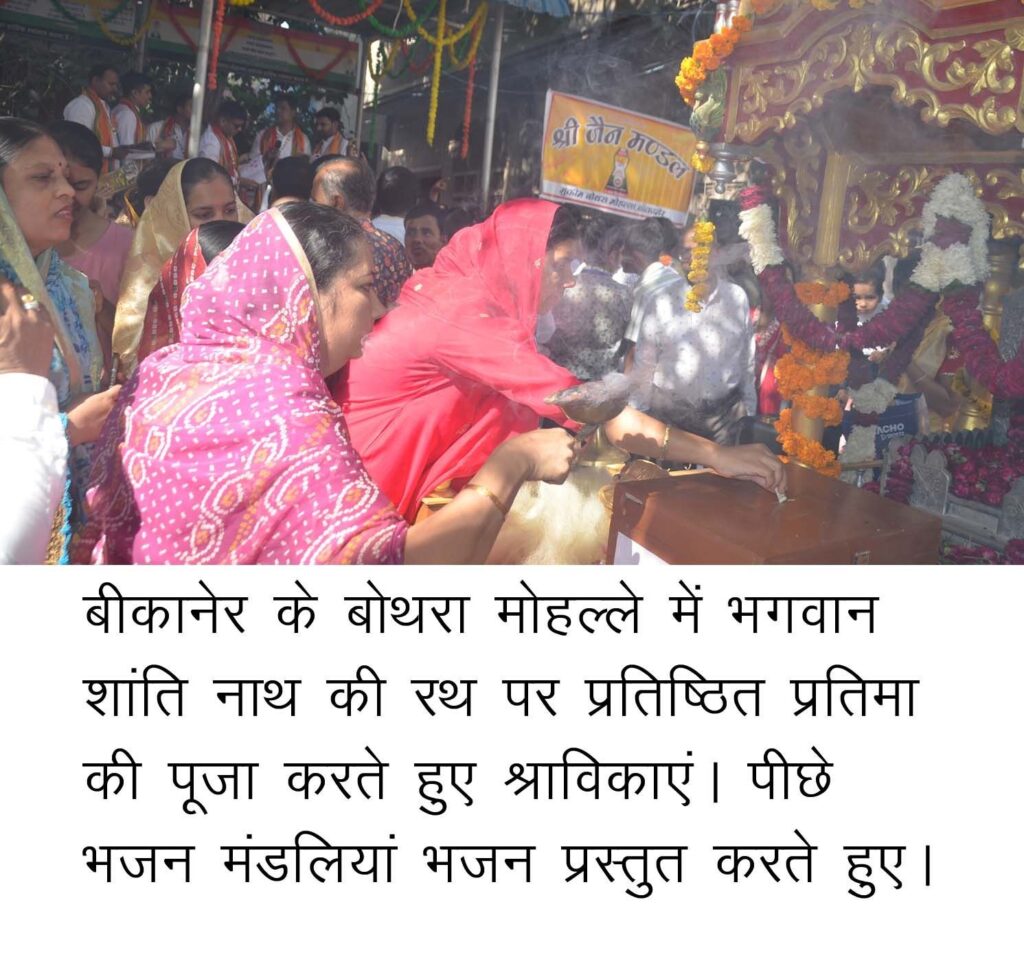 बीकानेर, 7 नवम्बर । श्री चिंतामणि जैन मंदिर प्रन्यास के तत्वावधान में सकल श्रीसंघ के सहयोग से शुक्रवार को भगवान की सवारी मेंं जगह-जगह भगवान शांति नाथजी की रथ में प्रतिष्ठित प्रतिमा की पूजा की गई। भजन मंडलियों ने विभिन्न जैन बहुल्य मोहल्लों में भजनों की प्रस्तुतियां दी। श्री गौड़ी पार्श्वनाथ में दो दिन के पड़ाव के बाद शुक्रवार को सुबह वहां से रवाना होकर कोटगेट, लाभुजी का कटला, जैन समाज की गवाड़ों में होते हुए भुजिया बाजार के श्री चिंतामणि जैन मंदिर में संपन्न हुई।