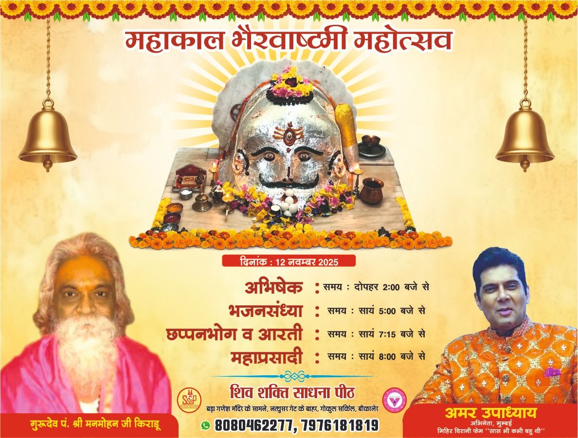 प्रख्यात भैरव उपासक पंडित मनमोहन किराडू द्वारा स्थापित शिव शक्ति साधना पीठ में हर वर्ष की भांति इस वर्ष भी महाकाल भैरव अष्टमी का आयोजन प्रख्यात ज्योतिष आचार्य पंडित प्रदीप किराडूके नेतृत्व में हो रहा है पीठ से जुड़े एडवोकेट मदन गोपाल व्यास ने बताया कि हर वर्ष की भांति इस वर्ष भी फिल्मी व टीवी कलाकार अमर उपाध्याय जो टीवी सीरियल क्यू की सास भी कभी बहू थी मे मिहिर वीरानी का किरदार अदा कर रहे हैं आ रहे हैं मंदिर परिसर पूर्ण रूप से सजाया जा रहा है और पीठ से जुड़े भक्तगण व्यवस्थाओं मैं लगे हुए हैं संदीप वीरेंद्र वसंत किराडू व कमल गोपाल गौरी शंकर रमेश गणेश लगे हुए हैं