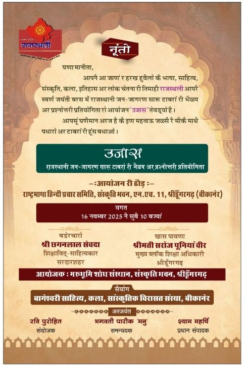 समारोह संयोजक साहित्यकार रवि पुरोहित ने बताया कि नई पीढ़ी को भाषा के संस्कारों से शिक्षित, संस्कारित और परिचित करवाने के लिए 16 नवम्बर 25 रविवार को राष्ट्रभाषा हिन्दी प्रचार समिति के प्रांगण में प्रातः 10 बजे राजस्थानी कहानी प्रश्नोत्तरी के कार्यक्रम उजास का आयोजन शिक्षाविद् साहित्यकार श्री छगनलाल सेवदा की अध्यक्षता और मुख्य ब्लॉक शिक्षा अधिकारी, श्रीडूंगरगढ़ श्रीमती सरोज पूनिया वीर के मुख्य आतिथ्य में बागेश्वरी साहित्य, कला, सांस्कृतिक विरासत संस्थान के सहयोग से किया जायेगा। समन्वयक कवयित्री भगवती पारीक ने बताया कि प्रश्नोतरी कार्यक्रम में प्रथम, द्वितीय और तृतीय स्थान पर रहने वाले विद्यार्थियों को 1100, 700 और 500 रुपए के नगद पारितोषिक के साथ पुरस्कृत किया जाएगा। पांच विद्यार्थियों को सान्त्वना पुरस्कार भी दिये जायेंगे। समारोह प्रबंधक श्रीमती सरोज शर्मा ने बताया कि उजास आयोजन में बच्चों द्वारा अपनी विभिन्न प्रतिभाओं यथा नृत्य, गायन, एकाभिनय, कविता पाठ आदि भी प्रस्तुत किये जायेंगे।
