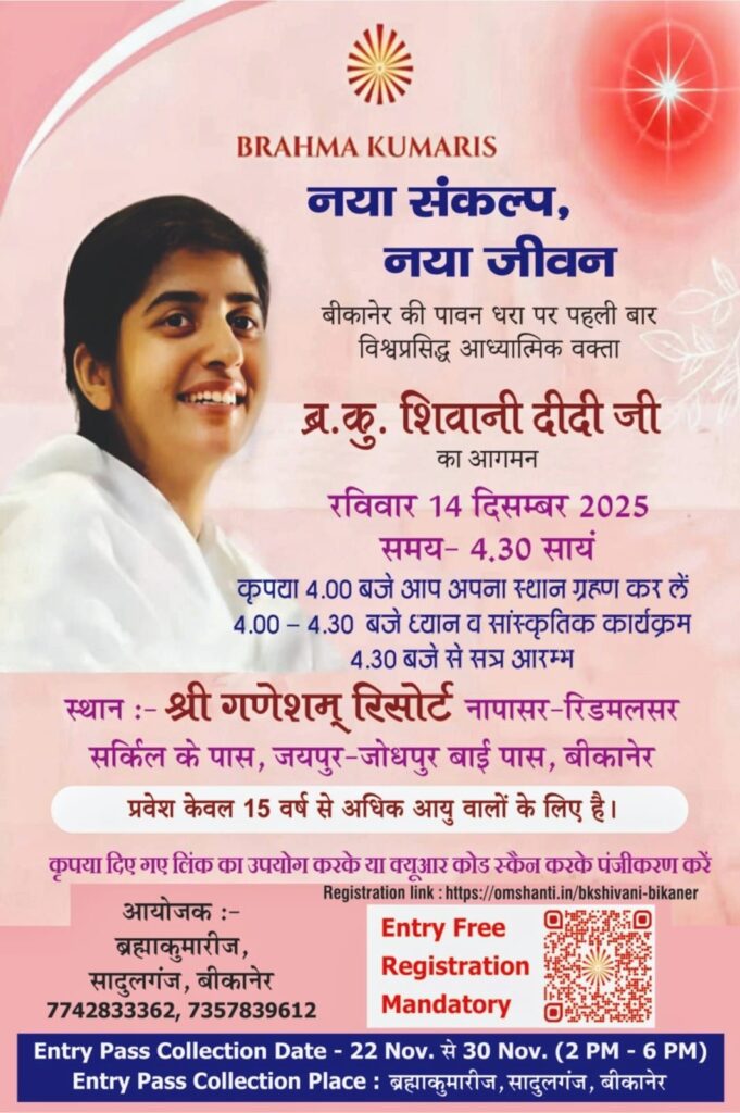 बीकानेर, 16 नवम्बर। राष्ट्रीय-अंतरराष्ट्रीय ख्याति प्राप्त आध्यात्मिक वक्ता बी.के. शिवानी रविवार 14 दिसम्बर 2025 को जयपुर जोधपुर बाई पास पर स्थित श्री गणेशम् रिसोर्ट में शाम चार बजे ’’नया संकल्प, नया जीवन’’ विषय पर विशेष व्याख्यान देंगी। इसके लिए क्यू आर कोड के माध्यम से प्रतिनिधि सैकड़ांे लोग पंजीयन करवा रहे है। अब तक बीकानेर नगर के साथ राजस्थान व देश के अनेक हिस्सों के करीब 2000 से अधिक लोगों ने पंजीयन करवाया है। कार्यक्रम स्थल पर पांच हजार से अधिक लोगों के बैठने की व्यवस्था की गई है।