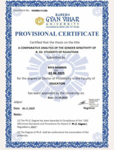 डॉ.रिया शर्मा को सुरेश ज्ञान विहार यूनिवर्सिटी, जयपुर से डॉक्टरेट (Ph.D.) की उपाधि प्रदान की गई है। उन्हें यह उपाधि सुरेश ज्ञान विहार यूनिवर्सिटी डॉक्टर भावना के मार्गदर्शन में ए कम्परेटिव एनालिसिस ऑफ़ जेंडर सेंसिटिविटी ऑफ़ बी. ऐड. स्टूडेंट्स ऑफ़ राजस्थान’ के विषय पर शोध किया गया था।