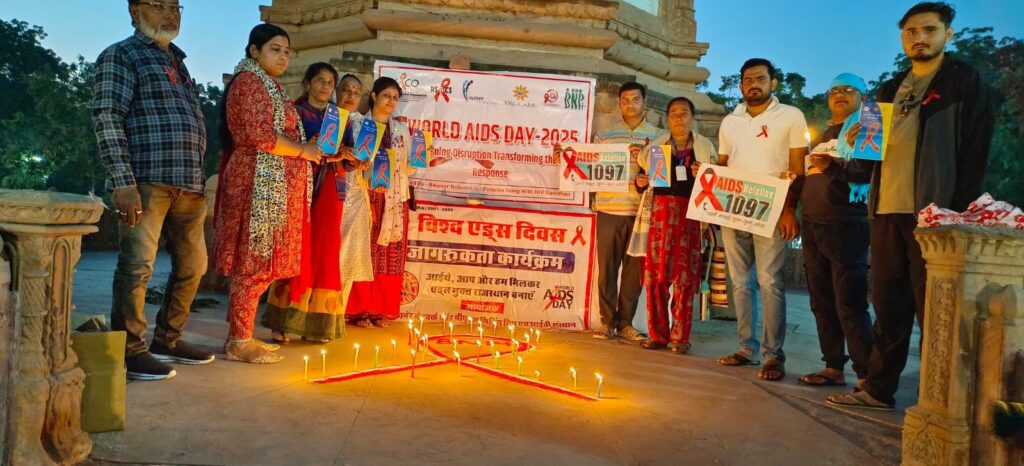 बीकानेर 30 नवम्बर 2025 को बीकानेर नेटवर्क फॉर पिपुल्स लिविंग विथ एचआईवी संस्थान द्वारा विश्व एड्स दिवस–2025 की पूर्व संध्या पर रंगोली और कैंडल लाइट के माध्यम से जागरूकता कार्यक्रम का आयोजन पब्लिक पार्क स्थित शहीद स्मारक पर किया गया। इस अवसर पर एचआईवी/एड्स के कारण दिवंगत लोगों को नमन करते हुए शांति एवं संवेदना संदेश के साथ कैंडल जलाकर श्रद्धांजलि अर्पित की गई।