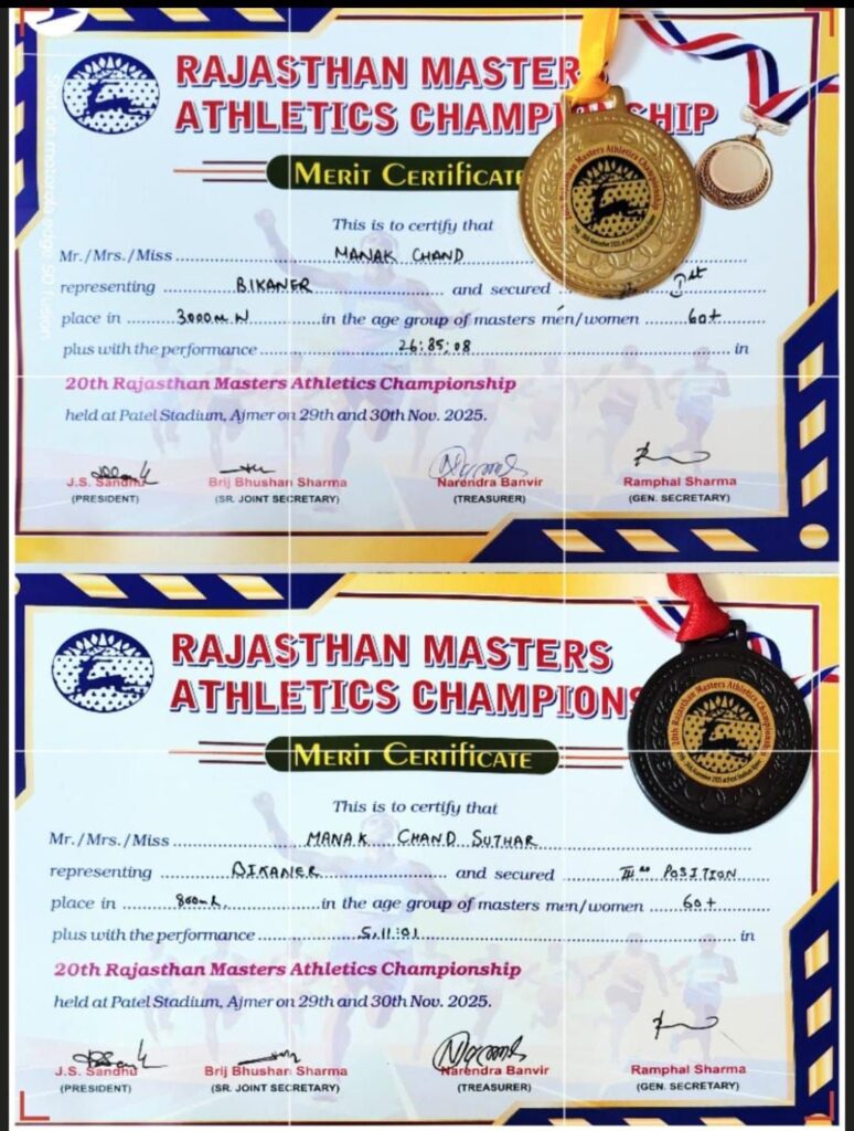 “राजस्थान मास्टर एथलेटिक्स प्रतियोगिता के 60 -65 आयु पदक विजेता रहे- खेल खेलने की भावना उम्र की मोहताज नहीं”- मानक चंद सुथार