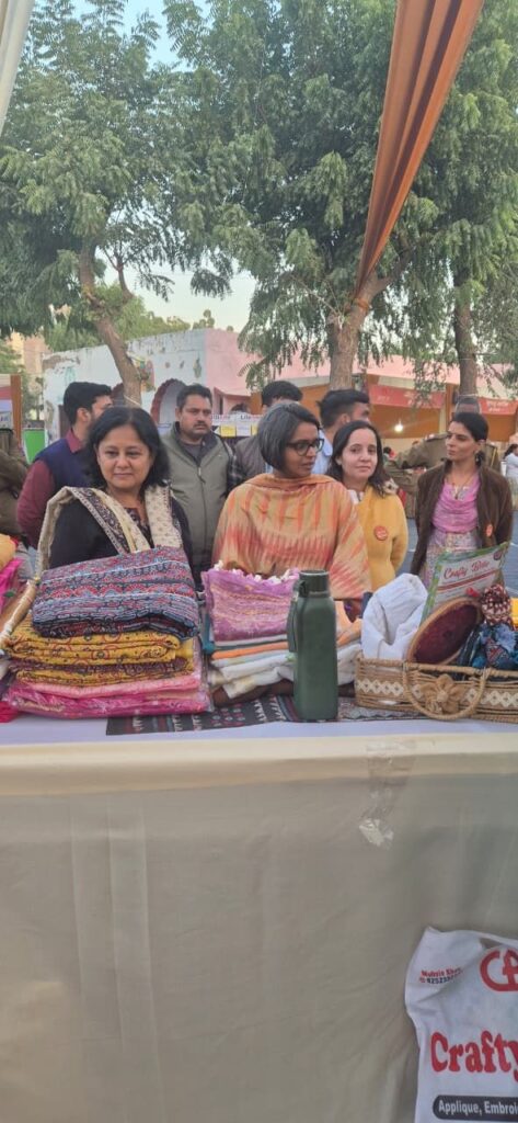 बीकानेर, 10 अक्टूबर। जिला प्रशासन और महिला अधिकारिता द्वारा जयनारायण व्यास कॉलोनी स्थित ग्रामीण हाट में आयोजित संभाग स्तरीय अमृता हाट ग्रामीण हाट मेले में बुधवार तक 9.5 लाख रुपए के उत्पादों का विक्रय हो गया है। मेला अब परवान पर है। प्रतिदिन बड़ी संख्या में लोग इसका अवलोकन करते हुए जमकर खरीदारी कर रहे हैं। बुधवार को जिला कलेक्टर श्रीमती नम्रता वृष्णि तथा अपर जिला एवं सेशन न्यायाधीश श्रीमती मांडवी राजवी सहित कई विशिष्ट जनों ने इसे देखा और खरीदारी की।