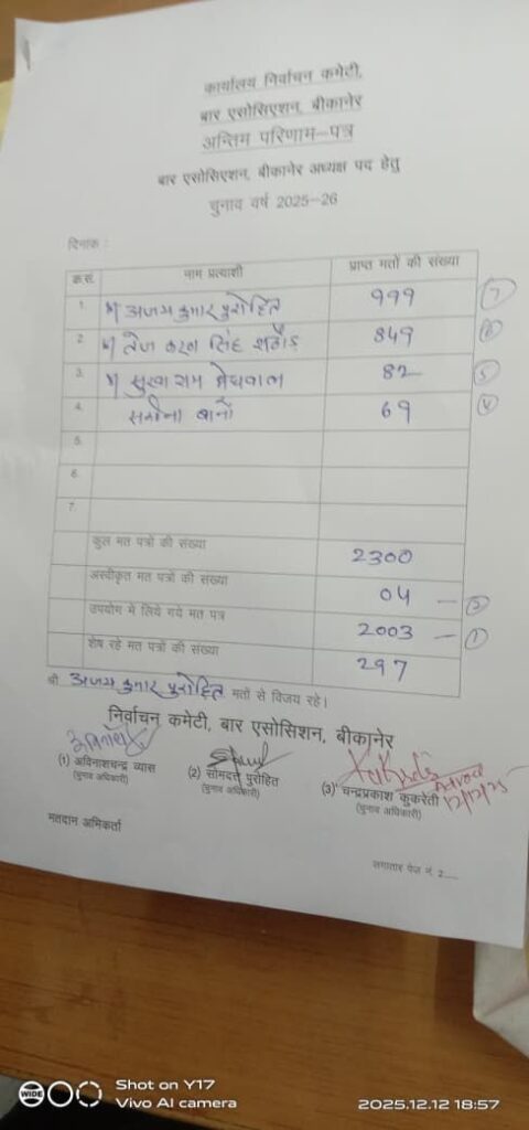 बीकानेर। बीकानेर बार एसोसिएशन अध्यक्ष पद पर अजय पुरोहित निर्वाचित घोषित हुए है। उन्होंने अपने निकटतम प्रतिद्धन्द्धी तेजकरण सिंह को 150 मतों से शिकस्त दी है। चुनाव संचालन समिति के एड अविनाश चन्द्र व्यास ने बताया कि 1999 मतों में से एड अजय पुरोहित को 999 मत प्राप्त हुए। जबकि तेजकरण सिंह को 849 मत मिले। वहीं अन्य दो प्रत्याशी सुखराम दावां को 82 तथा पहली बार चुनाव लड़ रही महिला प्रत्याशी को 69 मत हासिल हुए। व्यास ने बताया कि 2300 मतों में से 2003 मतदाताओं ने अपने मताधिकार का प्रयोग किया। इसमें से चार मत रद्द हो गये।
