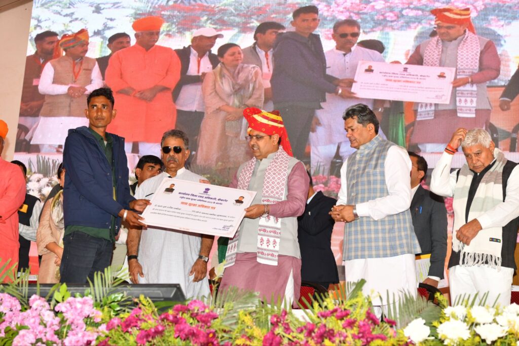 श्री शर्मा ने कहा कि बीकानेर जिले के युवाओं को 1 हजार 952 नियमित व 2 हजार 540 संविदा नियुक्तियां तथा 50 हजार बीमा पॉलिसी धारक किसानों को 206 करोड़ रुपये का बीमा क्लेम प्रदान किया गया है। इसी तरह 24 हजार महिलाओं को लखपति दीदियां बनाने के साथ ही 7 हजार 788 महिलाओं को राजीविका के माध्यम से संगठित आजीविका तथा राष्ट्रीय खाद्य सुरक्षा योजना के तहत 1.52 लाख नई यूनिटों को पात्र सूची में जोड़ा गया है। उन्होंने कहा कि 250 करोड़ रुपये से बरसलपुर नहर, 230 करोड़ रुपये से धोधा वितरिका एवं दांतौर वितरिका नहर, 150 करोड़ से चारणवाला ब्रांच प्रणाली, गोगड़ियावाला एवं बीकमपुर माइनर के खालों का जीर्णोद्धार एवं निर्माण करवाएंगे। साथ ही, 270 करोड़ रुपये से डॉ. करणी सिंह लिफ्ट नहर में शेष रहे 44 हजार 500 हेक्टेयर में फव्वारा सिंचाई सुविधा उपलब्ध कराने के लिए कार्य करवा रहे हैं। इसी तरह 300 करोड़ रुपये से बीकानेर कैनाल के पंजाब स्थित भाग में निर्माण कार्यों के लिए पीएफआर प्रस्तुत एवं 100 करोड़ रुपये से बीकानेर शहर में एकत्रित होने वाले गंदे पानी के समाधान हेतु निविदा जारी की जा चुकी है।