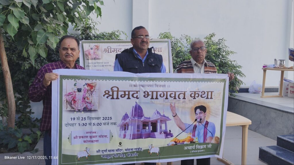बीकानेर 17 दिसंबर। जस्सूसर गेट के बाहर भगवती फाऊंडेशन कोलकाता की ओर से संचालित से दुर्गा माता मंदिर में 19 से 25 दिसंबर दोपहर 1:30 बजे से शाम 5:00 बजे तक संगीत में भागवत कथा होगी। कथा का वाचन विवेचन वृंदावन के आचार्य विक्रम जी करेंगे। मंदिर के संस्थापक प्रकाश कुमार मोहता ने वर्चुअल माध्यम से बुधवार को संवाददाताओं को बताया कि आचार्य विक्रम जी देश के विभिन्न स्थानों पर कथा कर चुके हैं। दुर्गा माता मंदिर के पीछे मोहता गार्डन में पहली बार होने वाली भागवत कथा के लिए 2000 श्रद्धालुओं के बैठने की व्यवस्था की गई है। कोलकाता आए पन्नालाल कोठारी और मंदिर के व्यवस्थापक पूर्व कैप्टन भीवाराम ने बताया की भागवत कथा के दौरान 22 को नंद उत्सव 23 को गिरिराज पूजा, 24 को श्री कृष्ण रुक्मणी विवाह पर उत्सव मनाया जाएगा तथा की पूर्णाहुति हवन के साथ 25 दिसंबर को होगी। कथा के प्रथम दिन मंदिर परिसर में कलश यात्रा निकाली जाएगी मंदिर के पंडित वृंदावन के अमित कुमार मिश्रा और अंकित कुमार मिश्रा पूजन कर कलश की प्रतिष्ठा करवाएंगे।
