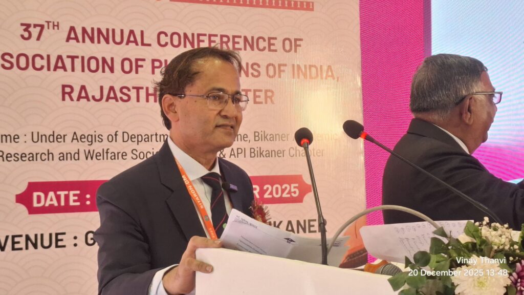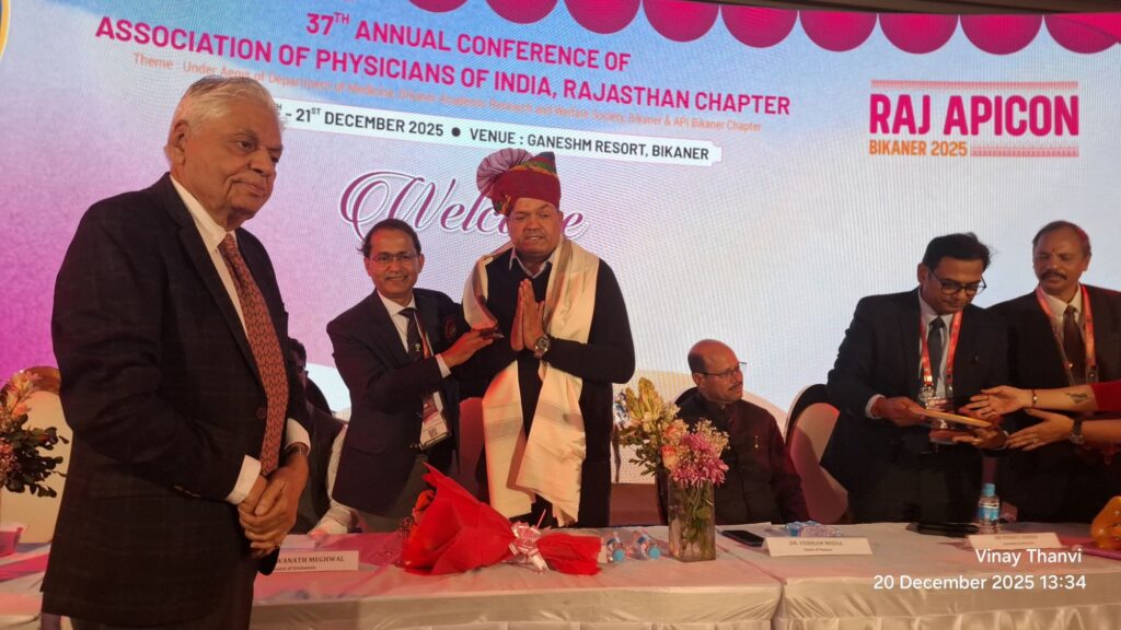 बीकानेर, 20 दिसंबर। एसोसिएशन ऑफ फिजिशियंस ऑफ इंडिया (API) के राजस्थान चैप्टर और सरदार पटेल मेडिकल कॉलेज के मेडिसिन विभाग संयुक्त तत्वावधान में 37वीं राज्य स्तरीय कॉन्फ्रेंस राजएपिकॉन 2025 का शनिवार को गणेशम रिसॉर्ट में भव्य शुभारंभ हुआ। खाद्य एवं नागरिक आपूर्ति मंत्री सुमित गोदारा ने मां सरस्वती के चित्र के समक्ष दीप प्रज्ज्वलित कर कॉन्फ्रेंस का उद्घाटन किया।