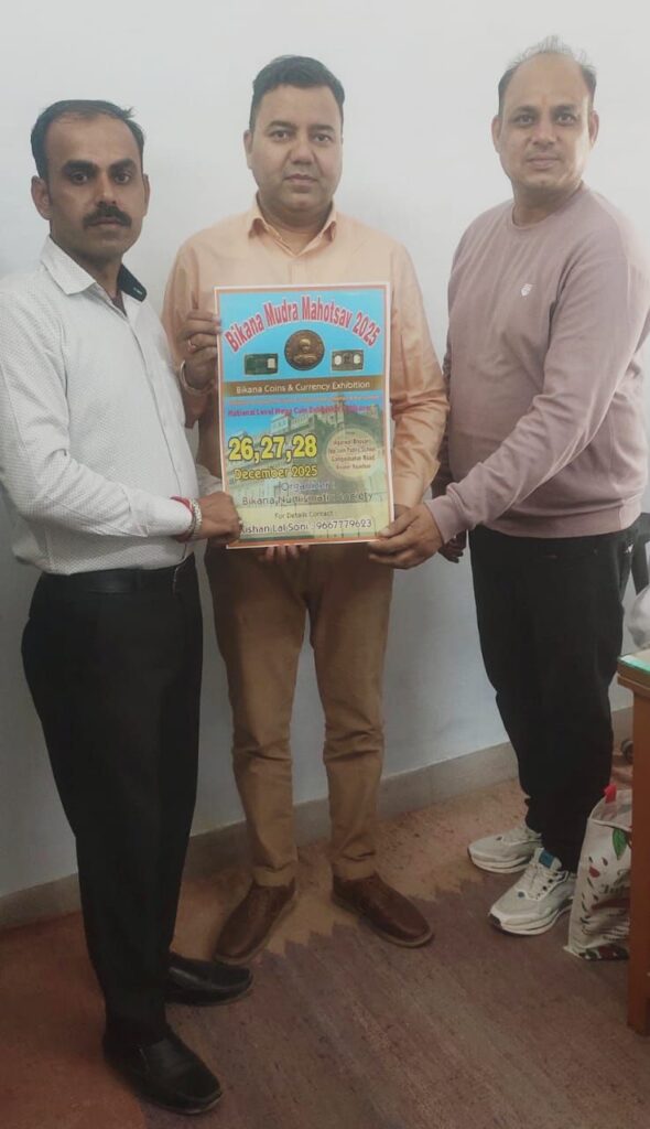 बीकाणा न्यूमिसमेटिक सोसायटी द्वारा आगामी 26,27,28 दिसम्बर को 3 दिवसीय बिकाणा मुद्रा महोत्सव का आयोजन किया जायेगा ।