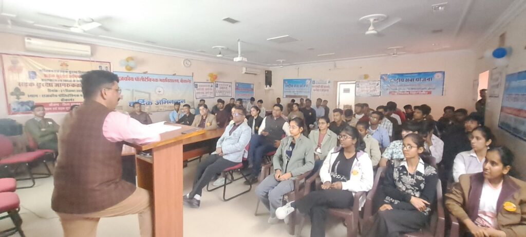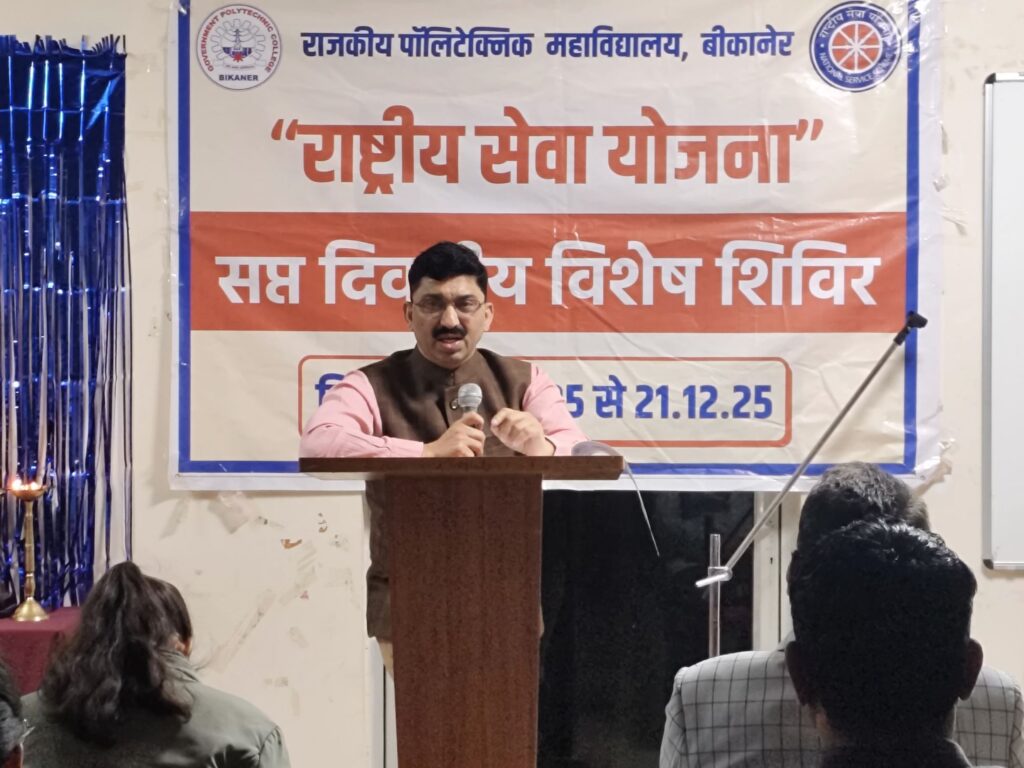 राजकीय पॉलिटेक्निक महाविद्यालय बीकानेर में राष्ट्रीय सेवा योजना का सात दिवसीय विशेष शिविर का समापन समारोह हर्षोल्लास के साथ सम्पन्न हुआ। एन एस एस प्रभारी हितेश सैनी ने बताया समापन समारोह कार्यक्रम का शुभारंभ सरस्वती माता के चित्र पर दीप प्रज्ज्वलन व सरस्वती वंदना के साथ किया गया। मुख्य अतिथि व मुख्य वक्ता प्रादेशिक परिवहन अधिकारी श्री अनिल पंड्या ज़ी, कार्यक्रम कि अध्यक्षता महाविद्यालय प्राचार्य श्री के के सुथार ने की तथा विशिष्ट अतिथि में विभागाध्यक्ष सिविल श्री सुमित राज भाटी, खले कूद प्रभारी डॉ एस एल प्रजापत व श्री प्रशांत जोशी प्रवक्ता कंप्यूटर रहे। प्राचार्य श्री सुथार ने आर टी ओ श्री पंड्या ज़ी का मालार्पण व स्मृति चिन्ह भेंट कर स्वागत किया। मुख्य वक्ता श्री पंड्या ज़ी ने सड़क सुरक्षा जागरूकता पर अपने व्याख्यान में ऑडियो-विजुअल तकनीक के माध्यम से उपस्थित स्वयंसेवकों को सड़क सुरक्षा से संबंधित विस्तृत जानकारी प्रदान की। उन्होंने सड़क पर वाहन चलाते समय बरती जाने वाली विभिन्न सावधानियों, यातायात नियमों के पालन, हेलमेट व सीट बेल्ट के उपयोग तथा तेज गति से होने वाली दुर्घटनाओं के दुष्परिणामों पर प्रकाश डाला। उन्होंने विद्यार्थियों से संवाद करते हुए प्रश्नोत्तरी भी आयोजित की, जिसमें सही एवं प्रभावी उत्तर देने वाले स्वयंसेवकों को RTO की ओर से पुरस्कृत किया गया।