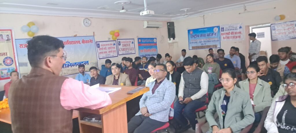 इससे पूर्व साइबर सुरक्षा पर व्याख्यान साइबर एक्सपर्ट श्री प्रशांत जोशी प्रवक्ता कंप्यूटर द्वारा, आपदा प्रबंधन पर व्याख्यान एस डी आर एफ टीम बीकानेर द्वारा तथा सोशल मीडिया स्क्रॉलिंग एडिक्शन पर व्याख्यान एक्सपर्ट श्री बाबू लाल ज़ी विभागाध्यक्ष इलेक्ट्रॉनिक्स ने प्रस्तुत किया तथा स्वयंसेवको द्वारा सेवा आश्रम सुदर्शना नगर बीकानेर में स्थित मंद बुद्धि, नेत्र हीन व मुखबधिर छात्राओं को खाना तथा कपड़े वितरित किये गये।