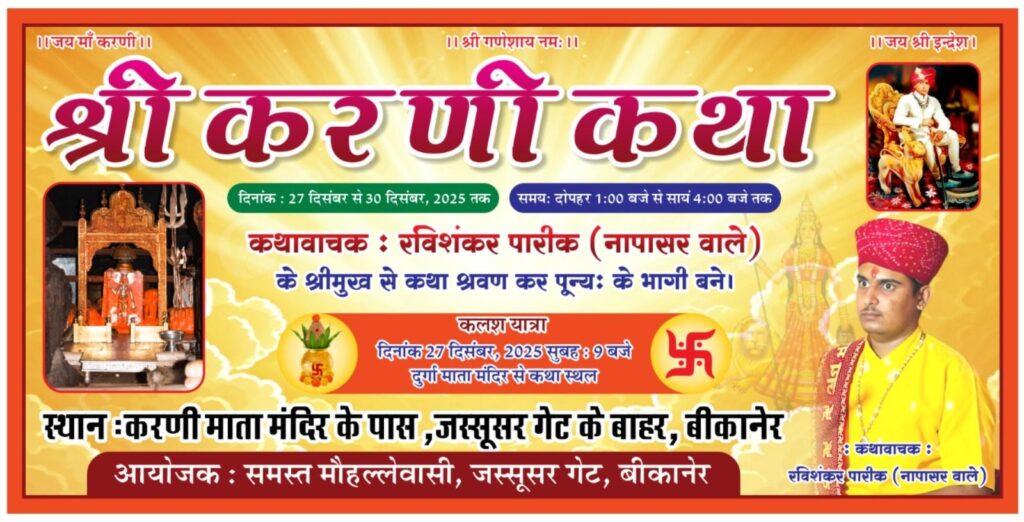 बीकानेर – जस्सुसर गेट के बाहर करणी माता मंदिर में श्री करणी कथा का आयोजन 27 दिसंबर से 31 दिसंबर तक होने जा रहा है। इस अवसर पर रूघाराम सोनी, महावीर कुमार सहदेव,एडवोकेट कमल साध, महेंद्र सिंह सांखला, गोवर्धन सोनी,देवेंद्र राजपुरोहित, पुजारी पुखराज जी उपाध्याय,आनंद सोनी, कैलाश सांखला,महावीर हलवाई उपस्थित हुए और बैनर का विमोचन किया। संचालनकर्ता के अनुसार कथा का आयोजन आमजन के सहयोग से 27 दिसंबर से 31 दिसंबर तक मंदिर परिसर में चलेगा। 27 दिसंबर को सुबह 9:30 बजे कलश यात्रा निकलेगी। कथा 1:00 बजे से 4:00 बजे तक चलेगी। कथा सुनने आने वाले भक्तों के लिए चाय पानी एवं नाश्ते की व्यवस्था रहेगी। कथा के हर दिन पांच जोड़े बैठ कर पूजा करवाएंगे। वैदिक मंत्रोचार के साथ कथा प्रारंभ होगी।अंतिम दिन 31 दिसंबर को महा प्रसादी का भव्य आयोजन होगा जिसमें भक्तगण बैठकर प्रसाद ग्रहण कर सकेगा।