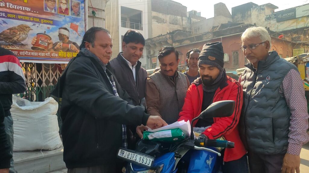 सुजानगढ़: चाइनीज मांझे के खिलाफ “एक मुहिम” में स्व. श्री जुगलकिशोर जी, स्व. श्री नंदकिशोर जी एवं स्व. श्री ताराचंद जी माटोलिया की पुण्य स्मृति में माटोलिया परिवार द्वारा सोमवार को एक जागरूकता अभियान चलाया गया। जिसमें बाइक एवं स्कूटी सवार लोगों को चाइनीज मांझे से बचाव के लिए गले में मफलर कैप पहनाई गई एवं नॉर्मल मांझा से पतंग उड़ाने की शपथ दिलवाई गई। नेताप्रतिपक्ष जयश्री दाधीच ने माटोलिया परिवार की सराहना करते हुए लोगों से चाइनीज मांझा उपयोग ना करने की सलाह दी। सेवा निवृत प्रधानाचार्य परमानंद मिश्रा ने शपथ पत्र का वाचन करते हुए लोगों को नॉर्मल मांझे का प्रयोग करने की शपथ दिलाई। अशोक माटोलिया ने बताया कि टीम अर्पिता शर्मा ने हमारे परिवार को इस जानलेवा मांझे से लोगों के हताहत होने और इस मुहिम में सहयोग करने की बात कही। टीम अर्पिता शर्मा की प्रेरणा से हमारे परिवार ने इस पुनीत कार्य में बढ़ चढ़ कर हिस्सा लिया।