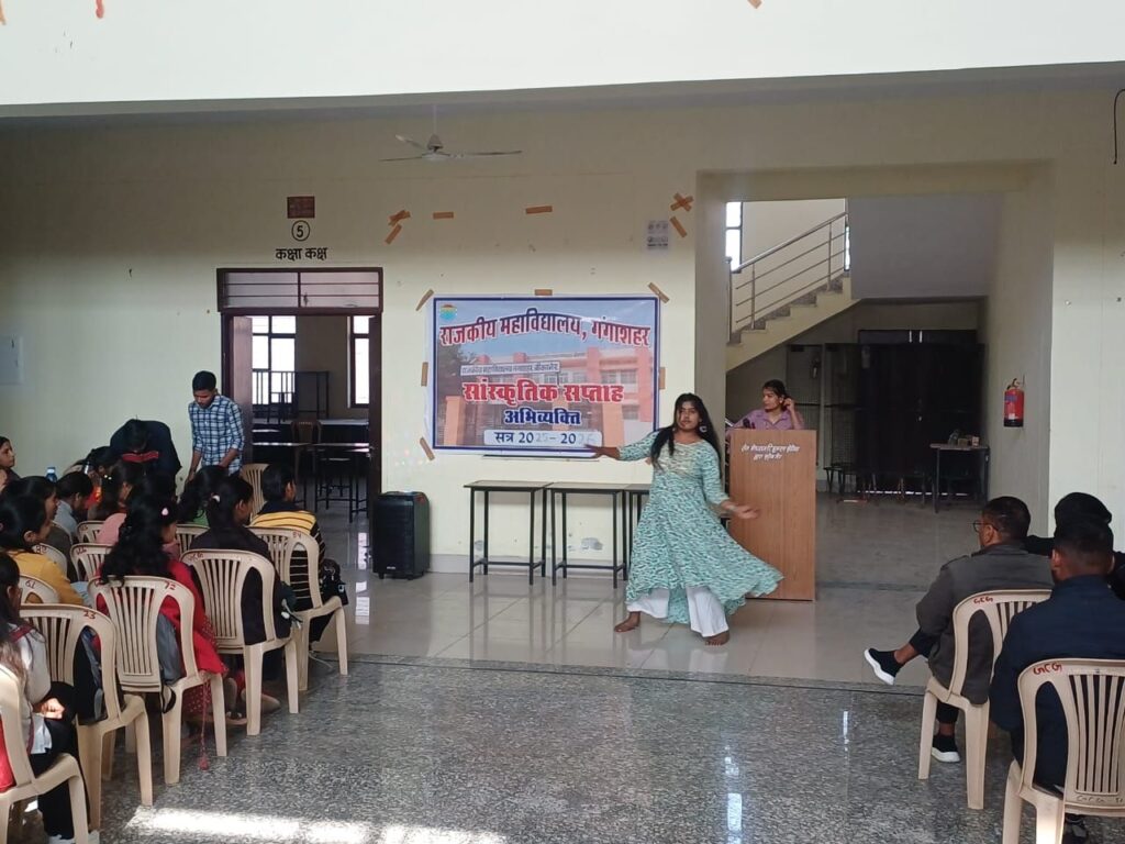 बीकानेर/गगांशहर,19 जनवरी 2026। राजकीय महाविद्यालय गंगाशहर में सांस्कृतिक सप्ताह ‘अभिव्यक्ति’ के अंतिम दिन एकल नृत्य और समूह नृत्य प्रतियोगिताओं का आयोजन किया गया। एकल नृत्य में प्रथम स्थान नैंणसी गहलोत ने तथा द्वितीय स्थान भगवती सोनी ने प्राप्त किया। समूह नृत्य में प्रथम स्थान योगिता समूह तथा द्वितीय स्थान मोनिका समूह ने प्राप्त किया। सांस्कृतिक सप्ताह के समापन के अवसर पर प्राचार्य डॉक्टर बबीता जैन ने अपने उद्बोधन में कहा कि नृत्य मन,शरीर और आत्मा का संपूर्ण व्यायाम है। इससे मानसिक और शारीरिक नियंत्रण होता है तथा विद्यार्थियों में आत्मविश्वास की भावना का विकास होता है।