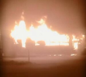 टक्कर के बाद बस में लगी आग, ऑटो लॉक हुई बस