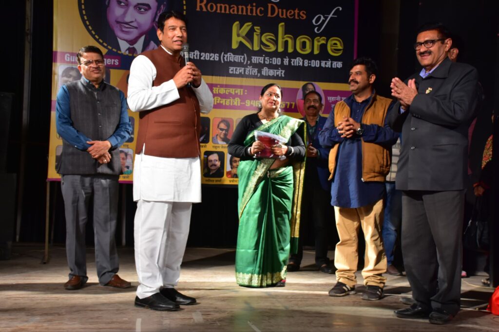 किशोर कुमार के रोमांटिक युगल गीतों के साथ अप्रतिम इवेंट्स का 23वां म्यूजिक शो कल टाउन हॉल में संपन्न हुआ! संस्कृति कर्मी एन डी रंगा ने कार्यक्रम की अध्यक्षता की! फल व सब्जी मंडी अध्यक्ष अरविंद मिड्ढा मुख्य अतिथि, राष्ट्रीय मीडिया प्रभारी भाजपा डॉ अशोक कुमार मीना अति विशिष्ट अतिथि, वरिष्ठ भाजपा नेत्री डॉ मीना आसोपा, एस कॉलेज के पूर्व प्राचार्य डॉ शिशिर शर्मा, प्रोफेसर डॉ राकेश माथुर, संगीत प्रेमी भारत प्रकाश श्रीमाली विशिष्ट अतिथि के रूप में मौजूद थे! अतिथियों के द्वारा मां सरस्वती के समक्ष दीप प्रज्ज्वलन कर कार्यक्रम का शुभारंभ किया गया! अप्रतिम क्लब के गायक सदस्यों के अलावा गोपिका सोनी व रश्मि शर्मा अतिथि गायिका थीं! अप्रतिम क्लब के सदस्यों द्वारा, खचाखच भरे टाउन हॉल में दी गई एक से बढ़कर एक प्रस्तुतियों ने श्रोताओं को मंत्रमुग्ध कर दिया! कार्यक्रम का संचालन सुहानी शर्मा ने किया! कुछ प्रस्तुतियों ने तो श्रोताओं को थिरकने पर भी मजबूर कर दिया!