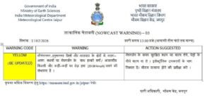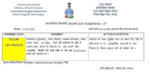 * आज एक नया पश्चिमी विक्षोभ सक्रिय होने से जोधपुर, बीकानेर, अजमेर, जयपुर, उदयपुर संभाग के कुछ भागों में दोपहर बाद मेघगर्जन के साथ हल्की बारिश होने की संभावना है।