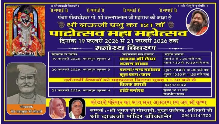बीकानेर। श्री दाऊजी प्रभु के 121वें पाटोत्सव महोत्सव का भव्य आयोजन 19 फरवरी 2026 से 21 फरवरी 2026 तक (फाल्गुन शुक्ल 2 से फाल्गुन शुक्ल4 ) तक किया जाएगा। आयोजन पंचमपीठाधीश्वर पूज्य श्री वल्लभलाल जी महाराज की आज्ञा से संपन्न होगा।