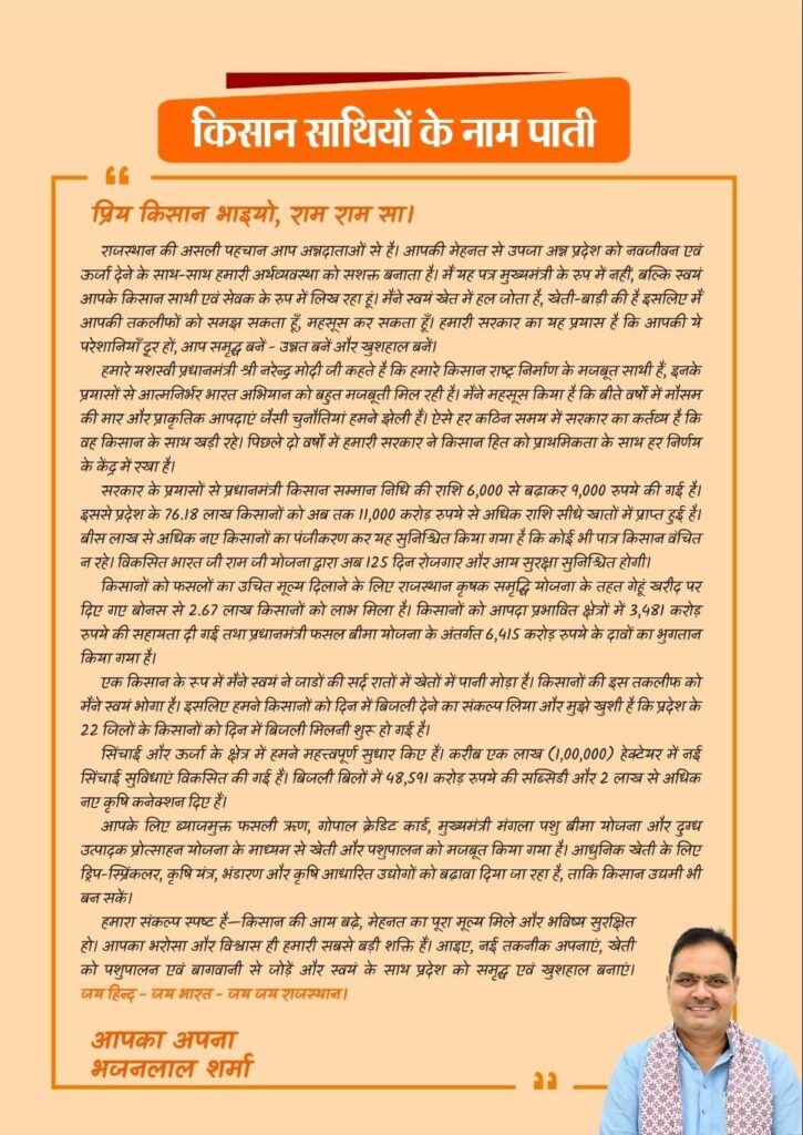 बीकानेर, 24 फरवरी। मुख्यमंत्री श्री भजन लाल शर्मा द्वारा युवाओं, किसानों और महिलाओं के लिए पाती लिखी गई है। मंगलवार को जिले में इस पाती के वितरण की शुरूआत किसानों को पाती वितरण के साथ हुई।