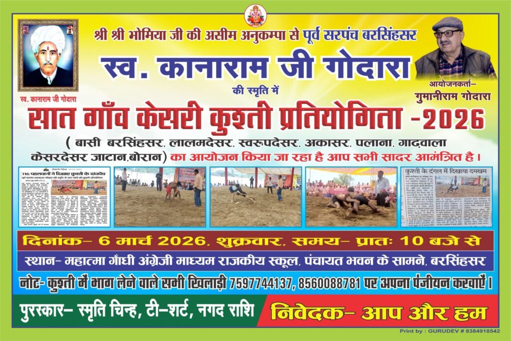 बरसिंहसर, बीकानेर – पूर्व सरपंच स्वर्गीय कानाराम जी गोदारा की स्मृति में सात गाँव केसरी कुश्ती प्रतियोगिता-2026 का आयोजन किया जा रहा है। यह प्रतियोगिता 6 मार्च 2026, शुक्रवार को सुबह 10 बजे से महात्मा गांधी अंग्रेजी माध्यम राजकीय स्कूल, पंचायत भवन के सामने, बरसिंहसर में आयोजित होगी।