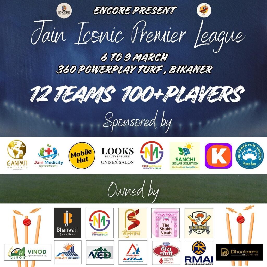 बीकानेर में क्रिकेट प्रेमियों के लिए एक बड़ा और रोमांचक आयोजन होने जा रहा है। Encore Events द्वारा प्रस्तुत जैन आइकॉनिक प्रीमियर लीग (JIPL) का आयोजन 6 मार्च से 9 मार्च 2026 तक 360 पावरप्ले टर्फ, बीकानेर में किया जाएगा। इस क्रिकेट लीग में 12 टीमें और 100 से अधिक खिलाड़ी भाग लेंगे।