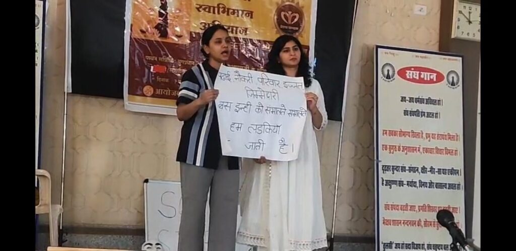 इसके साथ ही “नारी एक रूप अनेक” नाट्य की प्रस्तुति महिला मंडल की बहनों द्वारा , नारी के गुणों का वर्णन “हस्त मुद्रा ” के माध्यम से पूजा नौलखा द्वारा और एक MIME ACT ” SOUND OF SILENCE ” की प्रस्तुति पूजा नौलखा व चित्रा बैद के द्वारा दी गई ।