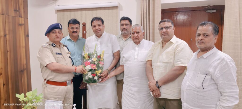 बीकानेर। बीकानेर व्यापार उद्योग मण्डल के प्रतिनिधिमण्डल ने नव पदस्थ पुलिस महानिरीक्षक श्री ओमप्रकाश जी का पुष्पगुच्छ भेंट कर एवं दुपट्टा पहनाकर स्वागत एवं अभिनंदन किया। इस अवसर पर मण्डल पदाधिकारियों ने उन्हें स्मृति चिन्ह भेंट कर सम्मानित भी किया।