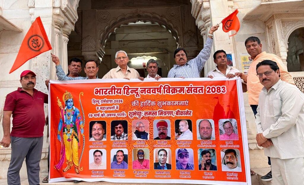 बीकानेर। बीकानेर मित्र एकता सेवा समिति द्वारा शहर में लगायें जाने वाले विक्रम संवत हिंदू नववर्ष 2083 के उपलक्ष्य पर 21 बैनर जिसका विमोचन मंगलवार की शाम को राजरतन बिहारी ठाकुर जी मंदिर के प्रांगण में मंदिर के पुजारी श्री कृष्ण मुरारी द्वारा विमोचन किया गया।