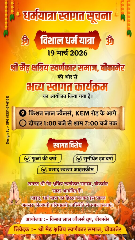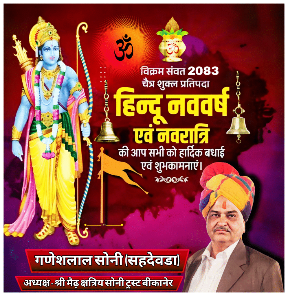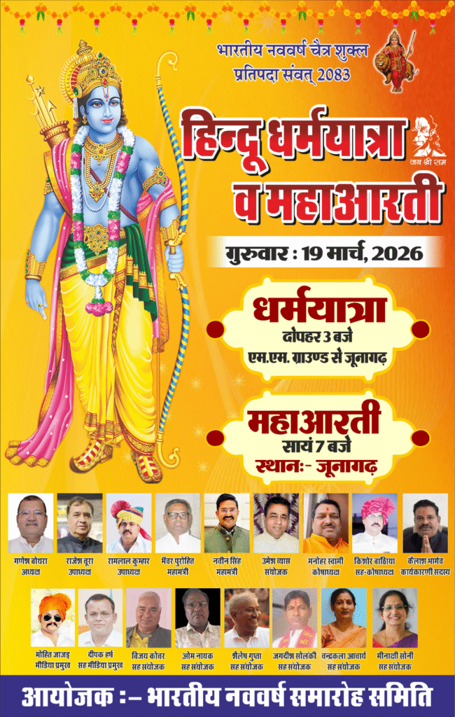 बीकानेर। ऊंट, घोड़े, रथ और बैंड-बाजों की धूम के साथ 19 मार्च, भारतीय नववर्ष चैत्र शुक्ल प्रतिपदा विक्रम संवत 2083 पर धर्मयात्रा एवं महाआरती का आयोजन किया जाएगा। भारतीय नववर्ष समारोह समिति के अध्यक्ष गणेश बोथरा ने बताया कि एकजुटता, आस्था और धर्म ध्वजा फहराते हुए हिन्दू नववर्ष का आगाज होगा। बोथरा ने बताया कि चैत्र शुक्ल प्रतिपदा के दिन ही प्रभु श्रीराम का राज्याभिषेक हुआ था, इसी दिन चैत्र नवरात्र प्रारंभ होते हैं तथा घट स्थापना की जाती है। ब्रह्माजी द्वारा सृष्टि रचना दिवस, महर्षि गौतम अवतरण दिवस, भगवान झूलेलाल अवतरण दिवस, विक्रम संवत् सहित सभी संवतों का प्रारंभ, आर्य समाज स्थापना दिवस एवं राष्ट्रीय स्वयं सेवक संघ संस्थापक डॉ. हैडगेवार का जन्मदिवस भी इसी दिन आता है। पूर्व यूआईटी चैयरमेन महावीर रांका ने बताया कि इस बार धर्मयात्रा व महाआरती का आयोजन ऐतिहासिक होगा। 19 मार्च, गुरुवार शाम लगभग 4 बजे पुष्करणा स्टेडियम से धर्मयात्रा का शुभारम्भ होगा। गोकुल सर्किल, नत्थूसर गेट, बारहगुवाड़, मोहता चौक, तेलीवाड़ा, दाऊजी मंदिर, जोशीवाड़ा, कोटगेट, केईएम रोड होते हुए जूनागढ़ पहुंचेगी, जहां महाआरती की जाएगी।