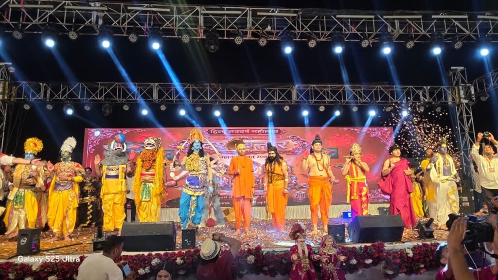 *विशेष आकर्षण* – ब्रह्मनाद कार्यक्रम का मुख्य आकर्षण रहा भगवान विष्णु का दशावतार जिसमें बीकानेर के नामी कलाकार सूर्यप्रकाश स्लाइट, राहुल किराड़ू और गजानन्द व्यास की टीम ने भगवान मत्स्य अवतार से कल्कि अवतार का नाट्यरूप में मंचन किया । मंचन में हर अवतार के बारे में भगवान नारद जी ने वर्णन किया और मत्स्य, कूर्म, वराह, नृसिंह, वामन, राम, कृष्ण, बुद्ध और कल्कि एक साथ मंच पर दिखे । मंच पर हिरण्यकश्यप, रावण, कंस का जहाॅं वध दिखाया गया वहीं भगवान बुद्ध द्वारा ज्ञान देते हुए दिखाया गया । मैदान में उपस्थित सभी जनमानस ने हाथ जोड़कर और वंदन करते हुए कार्यक्रम की खूब सराहना की एवं पूरे मैदान में महौल भक्तिमय हो गया ।