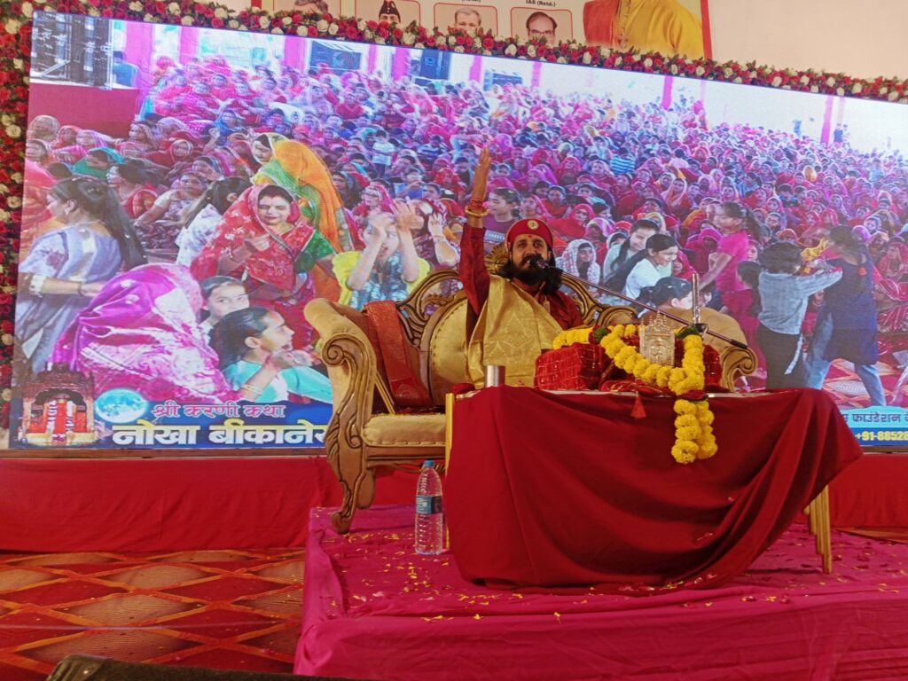 नोखा।। यूनाइटेड ग्लोबल पीस फाउंडेशन के तत्वावधान में नोखा में आयोजित सप्त दिवसीय श्री करणी कथा में रविवार को बड़ी संख्या में श्रद्धालु उपस्थित हुए और कथा का श्रवण कर मां करणी के चरणों में शीश नवाकर मंगल आशीर्वाद प्राप्त किया। कथा के दौरान महंत डॉ. करणी प्रताप ने मां करणी के विवाह उत्सव का वर्णन करते हुए इसे बड़े उत्साह और श्रद्धा के साथ मनाया। इस अवसर पर मातृशक्ति को मेहंदी वितरित की गई और महिलाओं ने अपने हाथों में मेहंदी रचाकर इस पावन अवसर की खुशी मनाई। महिलाओं ने नृत्य करते हुए और भक्ति गीतों पर झूमते-गाते हुए मां के मंगल परिणय की एक-दूसरे को बधाई दी। कथा में लगभग हजारों श्रद्धालुओं ने उपस्थित होकर मां करणी की महिमा का श्रवण किया और भक्ति भाव से कार्यक्रम में सहभागिता निभाई।
