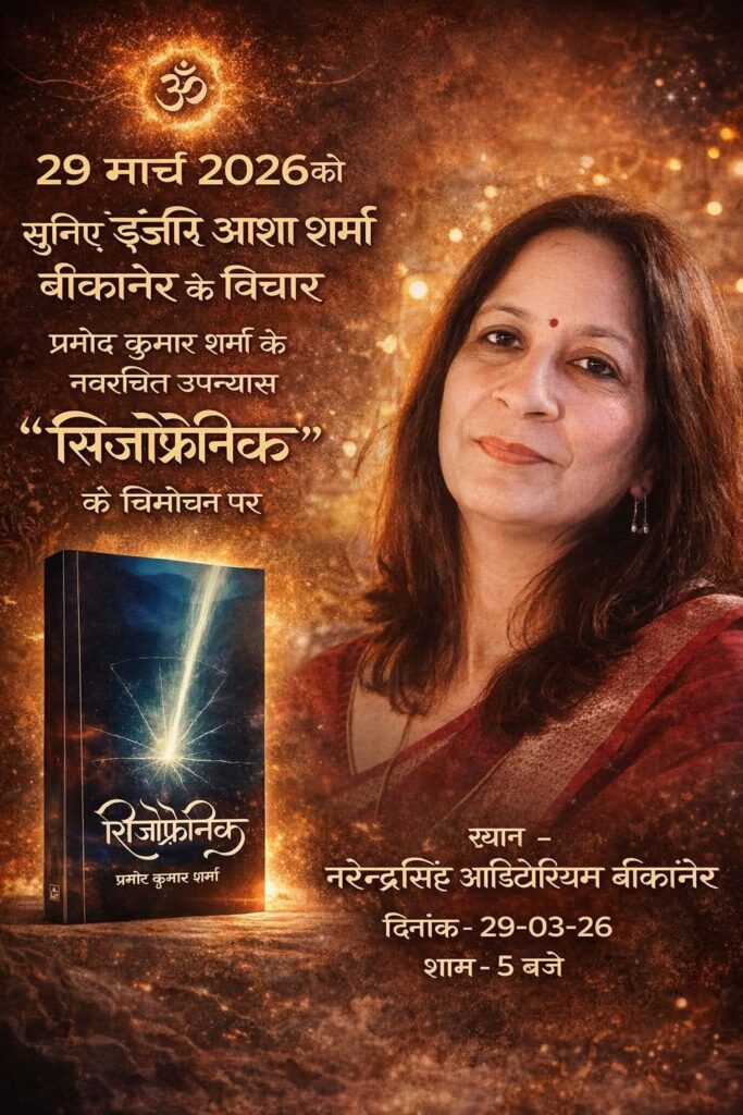 बीकानेर। शहर में आज साहित्य और मानसिक स्वास्थ्य के क्षेत्र से जुड़ा एक महत्वपूर्ण कार्यक्रम आयोजित किया जा रहा है। **नरेंद्र सिंह ऑडिटोरियम** में “सिजोफ्रेनिक” पुस्तक के विमोचन के अवसर पर विशेष चर्चा का आयोजन किया जाएगा, जिसमें मुख्य वक्ता के रूप में इंजीनियर आशा शर्मा अपने विचार प्रस्तुत करेंगी।