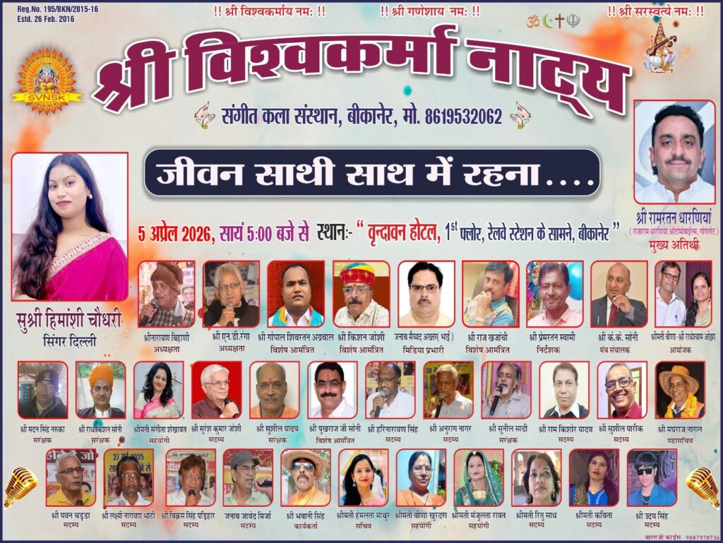 बीकानेर। श्री विश्वकर्मा नाट्य संगीत कला संस्थान, बीकानेर द्वारा आगामी 5 अप्रैल 2026 की संध्या को बीकानेर रेलवे स्टेशन के सामने वृंदावन होटल स्थित होल में ( जीवन साथी साथ में रहना’….) सदाबहार हिंदी फिल्मों के गीतों कार्यक्रम आयोजित किया जा रहा है। कार्यक्रम आयोजक एवं संस्था अध्यक्ष मेघराज नागल ने सोमवार को प्रेस विज्ञप्ति जारी कर बताया कि दिल्ली की सिंगर हिमांशी चौधरी बीकानेर के स्थानीय गायक कलाकारों के साथ डुएट सॉन्ग में हिंदी फिल्मों के नये पुराने सदाबहार गीतों की प्रस्तुतियां देंगी। कार्यक्रम के मुख्य अतिथि व्यवसायी एवं समाज सेवी रामरतन धारणिया होंगे। कार्यक्रम की अध्यक्षता सखा संगम अध्यक्ष एनडी रंगा और व्यवसायी एवं भजन गायक कलाकार नारायण बिहाणी संयुक्त रूप से करेंगे। कार्यक्रम के विशिष्ट अतिथियों में राज खंजाची, सुशील यादव,किसन जोशी,गोपाल अग्रवाल, शिवरतन अग्रवाल, पुखराज सोनी, संगीता शेखावत,मदन सिंह नरुका,प्रेम रतन स्वामी, रितू साध, वीणा ओझा,मंजू लता रावत, वीणा खुरदरा , हेमलता माथुर,ठाकुर भवानी सिंह सहित अन्य गणमान्य संगीत कला प्रेमी मौजूद रहेंगे । इस अवसर पर हिमांशी चौधरी के साथ मेघराज नागल, नारायण बिहाणी, इंजीनियर कमलकांत सोनी, रामकिशोर यादव, सुनील शादी, ठाकुर विक्रम सिंह पडिहार,पवन कुमार चड्ढा, सुशील पारीक, राधेश्याम ओझा, जावेद मिर्जा, उदय सिंह, लक्ष्मीनारायण भाटी, सुरेश कुमार जोशी, हरिनारायण सिंह, शाकिर हुसैन चौपदार आदि स्थानीय कलाकारों द्वारा प्रस्तुतियां दी जाएंगी।