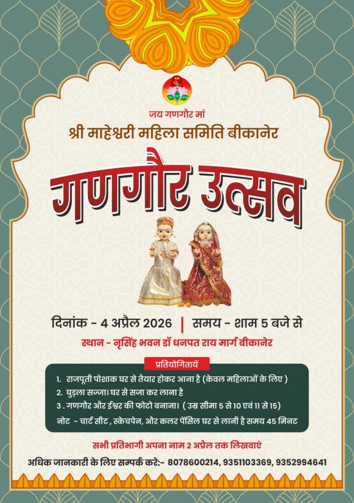 स्थानीय बीकानेर महिला समिति की निर्वतमान सचिव चंद्रकला कोठारीतथा उपसचिव रेनू झंवर से प्राप्त जानकारी के अनुसार आज की बैठक से पूर्व आयोजित बैठक में समिति की संरक्षिका महोदय द्वारा अलग-अलग कमिटियां बनाकर जो जिम्मेदारियां सोप गई थी उनके बारे में अध्यक्ष महोदया ने पुनः आज सभी सदस्यों से कार्यक्रम संबंधी रिपोर्ट प्राप्त की और बैठक में बताया कि लगभग सभी व्यवस्थाएं पूर्ण कर ली गई है तथा जो कुछ व्यवस्थाएं बाकी है वह भी अति शीघ्र पूर्ण कर ली जाएगी। समिति की सलाहकार प्रभारी अंजलि झंवर तथा संगीता बिनानी ने भी कार्यक्रम संबंधी जानकारी देते हुए बताया कि गणगौर उत्सव कार्यक्रम के अंतर्गत सदैव की तरह महिला समिति की ओर से विभिन्न प्रकार की प्रतियोगिताओं का आयोजन भी होगा जिसमें महिलाओं के लिए विशेष रूप से राजपूती ड्रेस प्रतियोगिता तथा घूडला सजावट प्रतियोगिता तथा बच्चों के लिए कार्यक्रम से पूर्व गणगौर संबंधी चित्रकला प्रतियोगिता होगी जिसका निर्धारित समय एक घंटा रहेगा तथा यह प्रतियोगिता दो वर्गों में जिसमें प्रथम वर्ग 5 से 9 वर्ष तथा द्वितीय वर्ग 10 से 14 वर्ष तक की आयु के लिए रहेगा। गणगौर चित्रकला प्रतियोगिता में भाग लेने वाले प्रतिभागियों को प्रतियोगिता संबंधी संपूर्ण सामग्री अपने साथ स्वयं लामीहोगी जिसमें कार्ड शीट तथा कलर भी शामिल होंगे