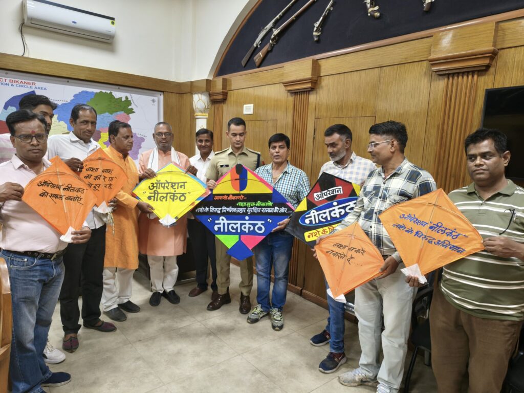 बीकानेर पुलिस अधीक्षक मृदुल कच्छावा ने कहा कि बीकानेर जिले में मादक पदार्थों की तस्करी तथा बेचने वालों के खिलाफ आपरेशन नीलकंठ में आमजन का सहयोग जरूरी है। जिले में मादक पदार्थों की तस्करी व बेचने व सेवन करने वाले लोगों का भविष्य बर्बाद कर रहे है ऐसे में सामाजिक कार्यकर्ताओं द्वारा किये जा रहे जागरूकता अभियान की सराहना करते हुए कही। जिले में मादक पदार्थों की रोकथाम के लिए आपरेशन नीलकंठ अभियान से जुड़े सामाजिक कार्यकर्ता भूरमल सोनी,सीए प्रणाम, कर्मचारी नेता भंवर पुरोहित, न्यायालयकर्मी राजकुमार पुरोहित, महावीर कुमार सहदेव, लक्ष्मण सोनी द्वारा अक्षय तृतीया पर पतंगों का जगह-जगह वितरण कर जागरूकता का कार्य किया जा रहा है।एस पी पतंगों पर मादक पदार्थों के खिलाफ अंकित श्लोगन पढ़कर अभिभूत हुए उन्होंने कहा कि कलाकार द्वारा पतंगो के कट आउट तथा नि:शुल्क वितरण करने से दूरदराज तक पचार प्रसार होकर आपरेशन नीलकंठ सफल हो सकेगा।अवैध मादक पदार्थ तस्करों पर सख्त कार्रवाई और बीकानेर में नशे की रोकथाम के के प्रयास के लिए पतंगों पर विभिन्न श्लोगन लिखी पतंगों का निःशुल्क वितरण किया गया। पतंगों पर पुलिस हैल्पलाइन नम्बर, नशे के दुष्परिणामों, हिंसक घटनाओं, तथा सड़क दुर्घटनाओ की जानकारी सम्बन्धित सन्देश उकेरें गये। आमजन नशे के तस्करों, आसपास नशे का सेवन व बेचने वालो की सूचना पुलिस को दे सके।बीकानेर में एसपी द्वारा नशे के विरुद्ध निर्णायक अभियान आपरेशन नीलकंठ को सफल बनाने के लिए आमजन से अपील की गई। चाइनीज़ मांझे का उपयोग न करे एवं बाल-विवाह रोकथाम सन्देश भी अंकित किए गए।अभियान निरन्तर जारी रख नशे के विरुद्ध निर्णायक प्रहार , सुरक्षित समाज आदि जानकारी लिखकर पतंगों माध्यम से आमजन तक पहुंचाई जाने के लिए निशुल्क पतंगों का वितरण किया जाएगा