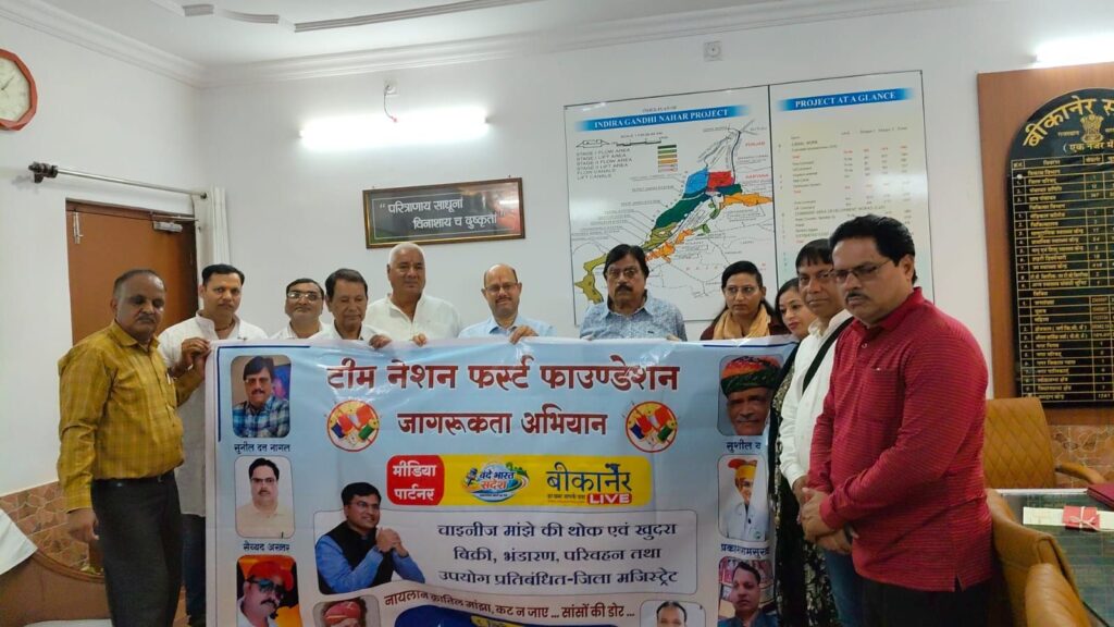 बीकानेर, 15 अप्रैल।टीम नेशन फर्स्ट फाउंडेशन एवं मित्र एकता सेवा समिति के संयुक्त तत्वावधान में चाइनीज मांझे के बहिष्कार एवं इसके उपयोग पर रोक लगाने के उद्देश्य से बुधवार को संभागीय आयुक्त कार्यालय में बैनर का विमोचन किया गया। इस अवसर पर संभागीय आयुक्त श्री विश्राम मीणा ने बैनर जारी कर अभियान की शुरुआत की।