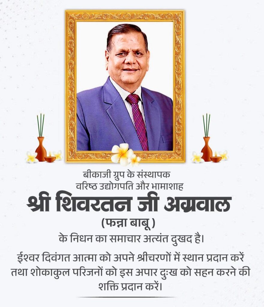 बीकानेर। बीकानेर व्यापार उद्योग मंडल के पूर्व अध्यक्ष श्री शिवरतन जी अग्रवाल (फन्ना बाबू) के निधन पर शहर में शोक की लहर व्याप्त है। उनके निधन पर श्रद्धांजलि अर्पित करने हेतु बीकानेर व्यापार उद्योग मंडल द्वारा 24 अप्रैल 2026 को दोपहर 2:00 बजे तक बीकानेर बंद रखने का आह्वान किया गया है।