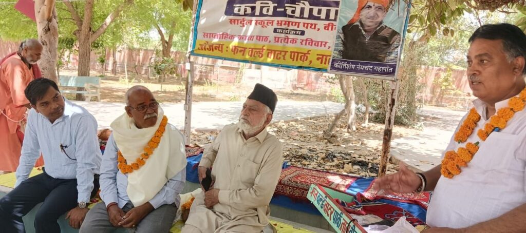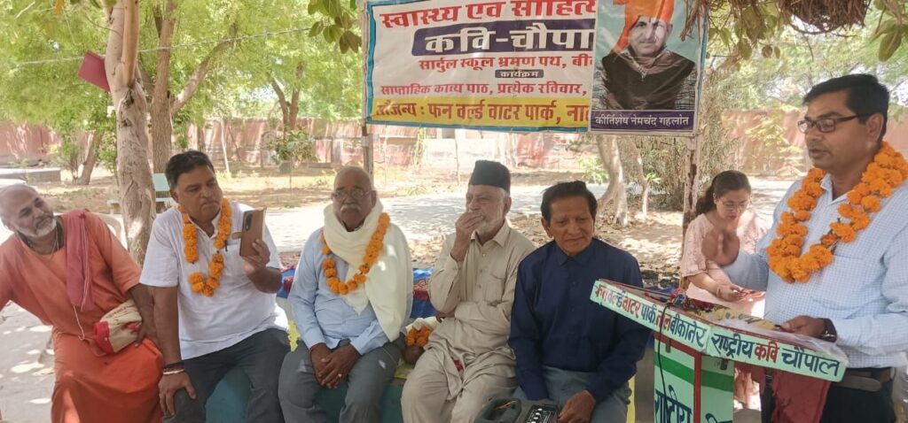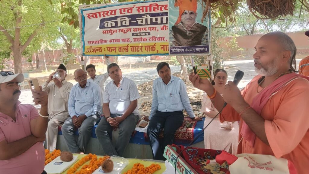 राष्ट्रीय कवि चौपाल की 565 वीं कड़ी गाय माता सृष्टि हित का नाता विषय को समर्पित रही आज के कार्यक्रम अध्यक्षता में गौ सेवाधारी गिरधारी लाल सुथार मुख्य अतिथि में सिंह स्थल संत दौलतराम जी, महेंद्र जोशी, भंवर लाल लिम्बा, सरदार अली परिहार एवं पम्मी कोचर आचार्य आदि मंच सुशोभित हुए, कार्यक्रम शुभारम्भ करते हुए रामेश्वर साधक ने स्व बौद्धिक में कहा कि रे जीव तू गौ सेवा कर, स्वयं को भूल कर जीते जी अमर हो जाता। वेद पुराण शास्त्र यही समझाएं समझ गाय माता सृष्टि हित नाता।।