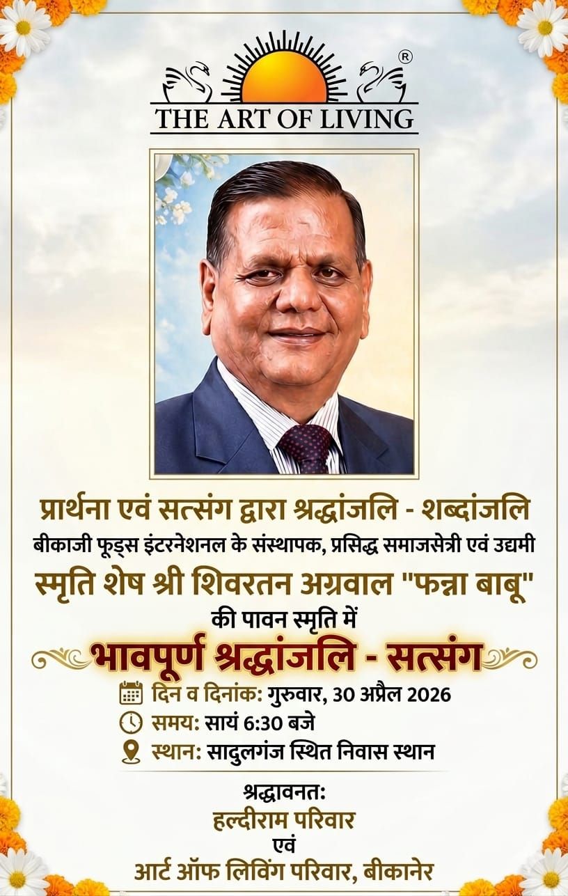 बीकानेर। बीकानेर के लब्ध प्रतिष्ठित उद्यमी एवं समाजसेवी तथा बीकाजी फूड्स इंटरनेशनल के संस्थापक शिवरतन अग्रवाल “फन्ना बाबू” की स्मृति में आर्ट ऑफ लिविंग के बीकानेर केंद्र द्वारा 30 अप्रैल को भावपूर्ण श्रद्धांजलि – सत्संग का आयोजन किया जाएगा। आर्ट ऑफ लिविंग ब्यूरो कम्यूनिकेशन के बीकानेर संभांग के समन्वयक गिरिराज खैरीवाल ने बताया कि फन्ना बाबू का असामयिक देहावसान पिछले सप्ताह हो गया था। उनकी पावन स्मृति में उनके सादुलगंज स्थित निवास स्थान पर गुरुवार, 30 अप्रैल 2026 को सायं 6:30 बजे आयोज्य श्रद्धांजलि सत्संग में अंतरराष्ट्रीय ख्याति प्राप्त सुमेरू भजन गायक जितेन्द्र सारस्वत द्वारा भक्ति भाव से ओतप्रोत भजनों की सुमधुर प्रस्तुतियों एवं सत्संग के माध्यम से शब्दांजलि अर्पित की जाएगी।
