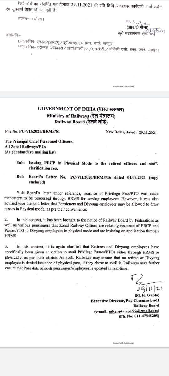 रेल कर्मचारियों एवं सेवानिवृत्त कर्मचारियों को रेलवे बोर्ड के द्वारा पूर्व मे आदेश निकल कर HRMS के द्वारा ऑनलाईन पास जारी करने के आदेशों को निरस्त करने के लिए ऑल इंडिया रेलवे मैन्स फेडरेशन द्वारा इसका पुरजोर विरोध किया गया Airf के महासचिव एवं AGM के सयोजक कॉम शिव गोपाल मिश्रा द्वारा इसका विरोध कर इस मे आ रही परेशानी जैसे कर्मचारियों को इस का पूरा ज्ञान नही होना, HRMS साइड का अतिव्यस्त होना , भिन्न भिन जोन के मंडलों मे साइड लाइन स्टेशनों पर इंटरनेट आदि की पर्याप्त सुविधा नही होना, सेवानिवृत्त कर्मचारियों को इस की पूरी जानकारी का अभाव के कारण आ रही परेशानी के बारे मे विस्तार से चर्चा करते हुए रेल बोर्ड मे इस मुद्दे को उठाया ।